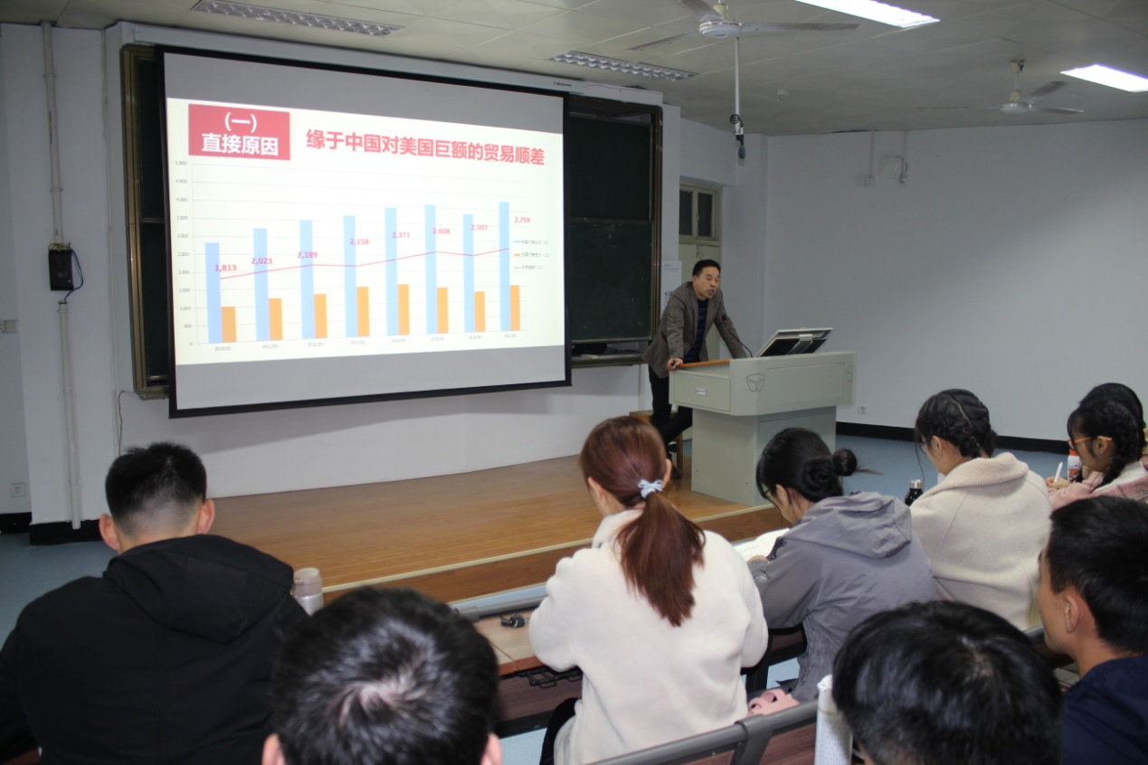 11月21日晚上,德赢官网2019年研究生学术活动月“读原著学原文悟原理”系列校内讲座第三场在人文楼408教室举行,由王帆宇博士做《新时代中国外交面临的机遇、挑战与对策——以中美贸易摩擦为例》专题讲座。学院全体研究生参加了讲座。