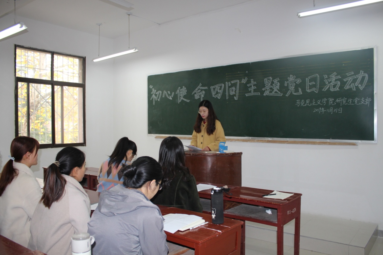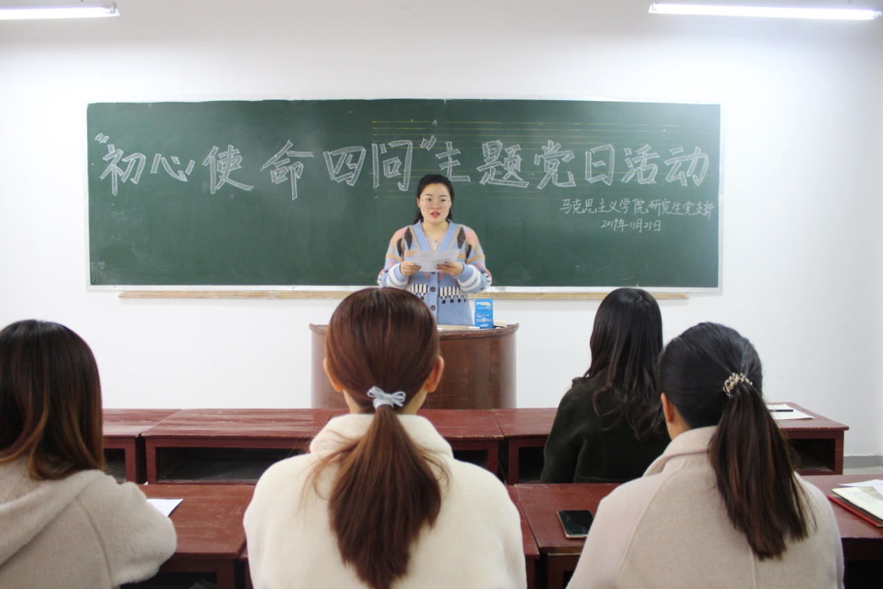 为推进“不忘初心、牢记使命”主题教育的深入开展,引导支部党员牢记理想信念,做到初心不改、使命在肩、主动作为,11月21日下午,德赢官网研究生党支部在教五楼201教室开展了“初心使命四问”主题党日活动,支部党员认真参加。活动由支部副书记李频捷主持。
