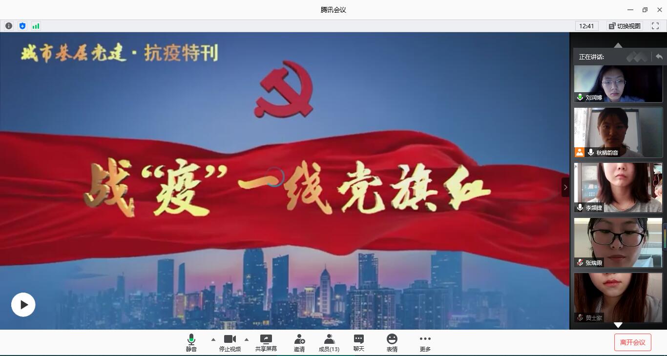 为扎实推进“牢记初新使命,争当出彩先锋”主题教育,不断升华理想信念,传承红色基因,牢记初心使命。6月28日下午,德赢官网研究生党支部组织开展《战“疫”一线党旗红》线上观影学习交流活动,支部全体党员参与会议,会议由支部副书记李频捷主持。