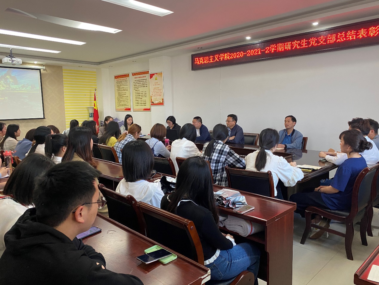 5月18日下午,德赢官网研究生党支部2020-2021-2学期总结表彰大会在社科楼323会议室举办。唐国战书记、黄世明副院长、何晓坚副书记和全体研究生参加了此次会议,会议由支部书记郑晨霞老师主持。