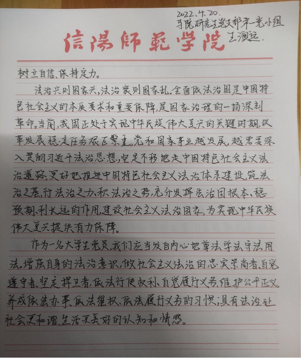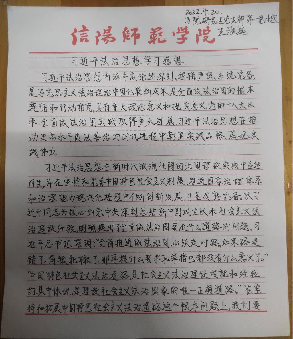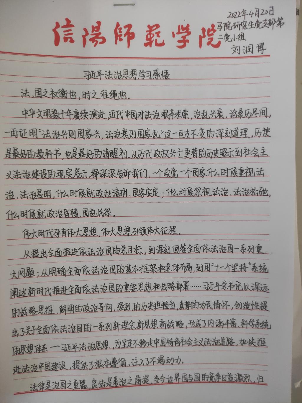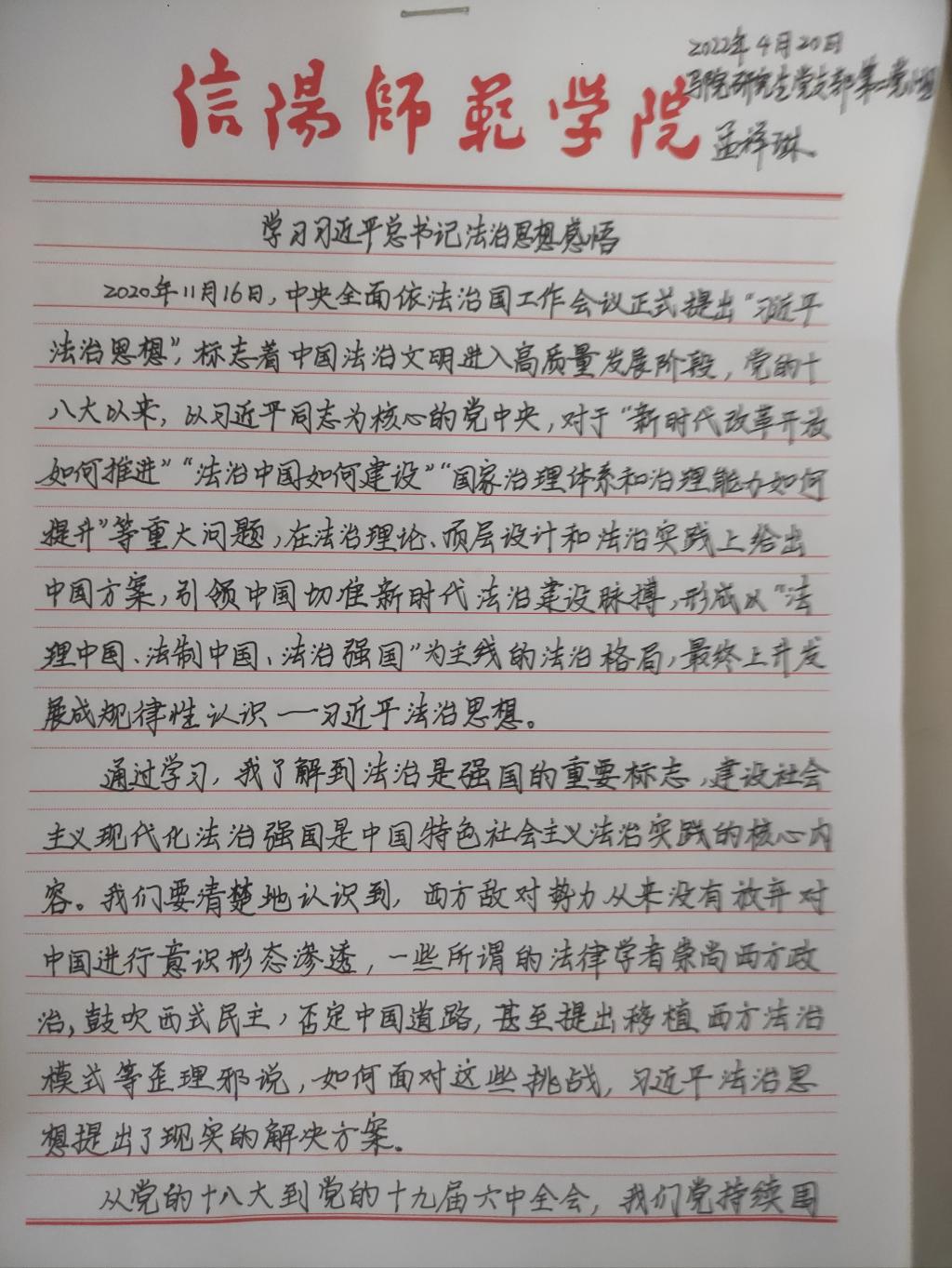 为深入学习贯彻习近平法治思想,增强德赢官网研究生党员的政治素养和法治意识,德赢官网研究生党支部开展了习近平法治思想学习交流主题党日活动。德赢官网研究生党员、预备党员及发展对象积极参与,充分运用互联网等多渠道展开学习,通过观看相关法治宣传片、系统学习习近平法治思想,进一步增强法治意识和思想觉悟。大家根据学习情况,结合自身实际,认真撰写学习习近平法治思想的心得感悟,以下为部分同志撰写的心得感悟图片。