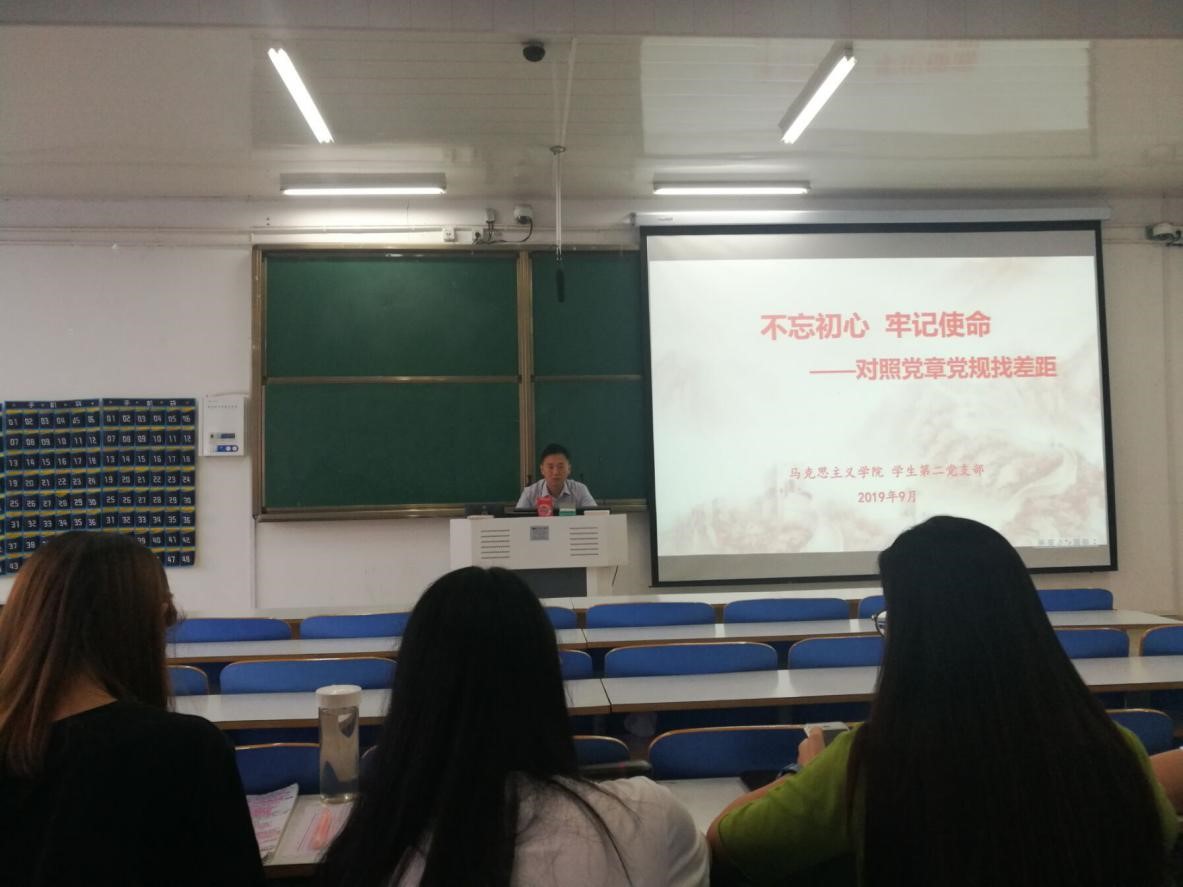 2019年9月24日下午,德赢AC米兰官网学生第二党支部在社科楼516开展“不忘初心,牢记使命—对照党章党规找差距”主题党日活动。学生第二党支部书记曹栋、支部党员参加此次活动。会议由支部书记动曹栋主持。