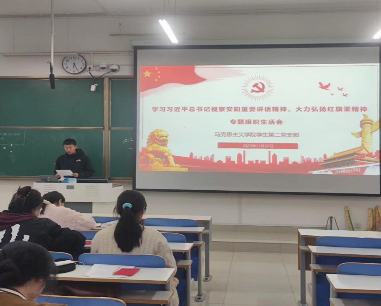 为深入学习贯彻党的二十大会议精神和习近平总书记视察河南安阳重要讲话精神,以实际行动推动高水平师范大学建设,11月22日晚上,德赢AC米兰官网学生第二党支部在社科楼414教室以“深入学习习近平总书记视察安阳重要讲话精神,大力弘扬红旗渠精神”为主题,围绕“习近平总书记视察安阳重要讲话精神”召开专题组织生活会。会议由于嘉宁同志主持。