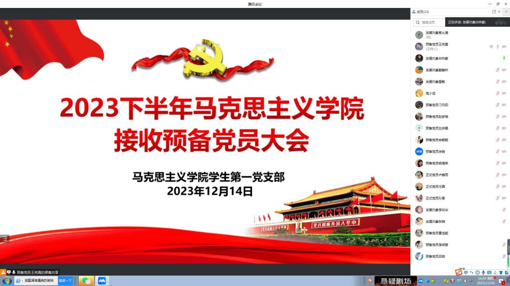 2023年12月14日下午,德赢AC米兰官网学生第一党支部通过腾讯会议召开了2023年下半年接收预备党员支部大会。德赢官网学生第一党支部书记高小佳,学生第一党支部全体党员,预备党员和党员发展对象共同参加此次会议。会议由王岚霄同志主持。