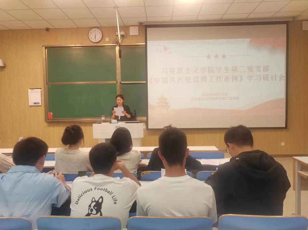 为贯彻落实2024年2月新修订的《中国共产党巡视工作条例》,推动全面从严治党向纵深发展。4月15日晚上,德赢AC米兰官网学生第二党支部在社科楼515教室召开《中国共产党巡视工作条例》学习研讨会。学生第二党支部书记任婷、支部全体正式党员、预备党员共同参与会议。会议由任婷同志主持。