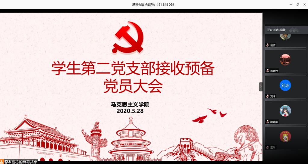 5月28日上午10:00,德赢AC米兰官网学生第二党支部接收预备党员大会通过腾讯会议线上平台顺利举行。德赢官网学生第二党支部支部书记曹栋、入党介绍人陶青青、杨胜利及第二党支部党员、八位接收预备党员共同参加此次会议。会议由曹栋主持。
