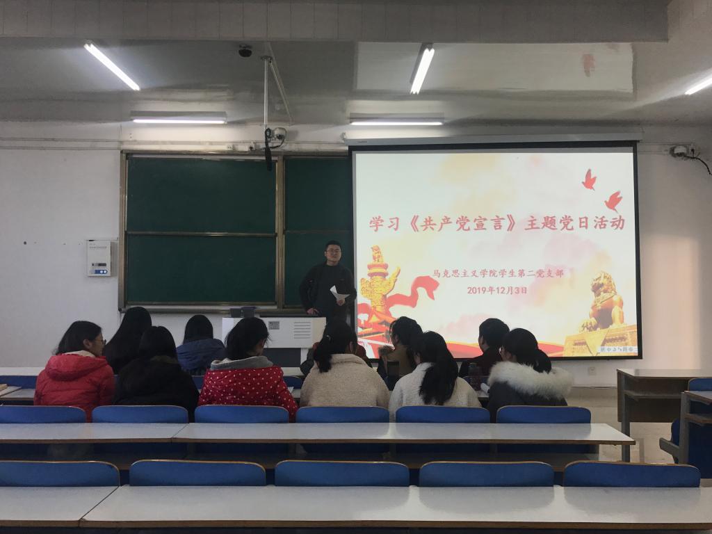 学习马克思主义基本理论是共产党人的必修课,为加强对马克思主义经典著作的学习研究,12月3日下午,德赢官网学生第二党支部在社科楼514教室开展学习《共产党宣言》主题党日活动。学生第二党支部组织委员杨胜利、全体预备党员参加活动。活动由杨胜利主持。