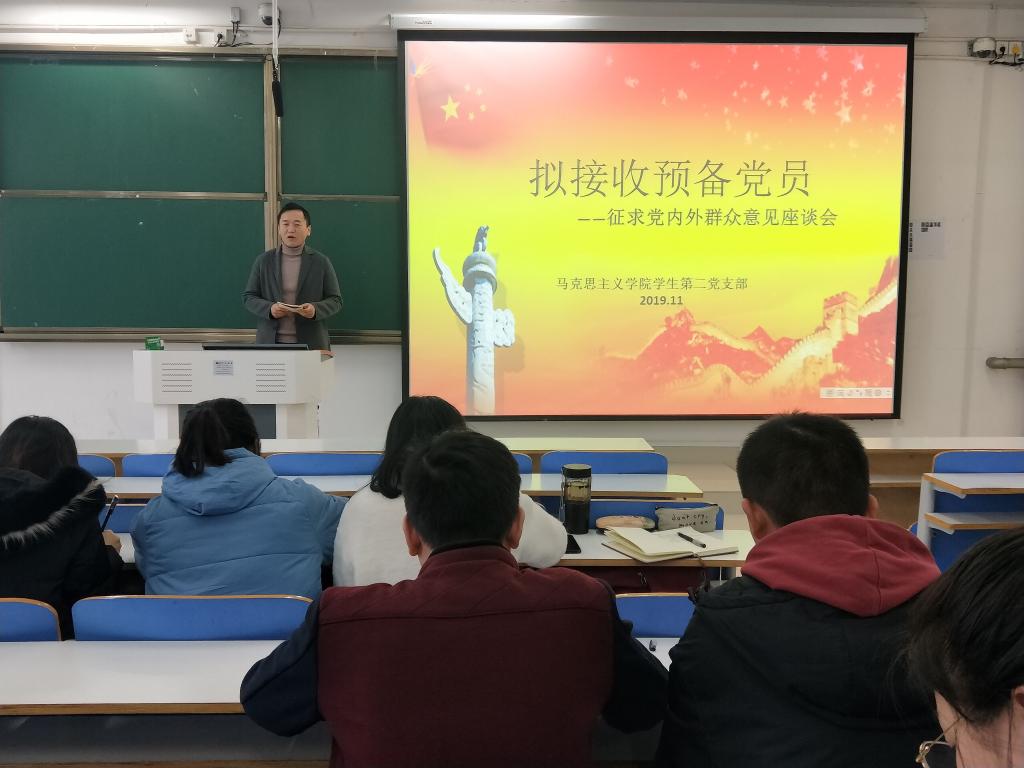 11月25日,德赢官网学生第二党支部在社科楼516教室召开征求党内外群众意见座谈会。学生第二党支部预备党员、发展对象和部分群众参加了此次会议。本次会议由支部书记曹栋主持。