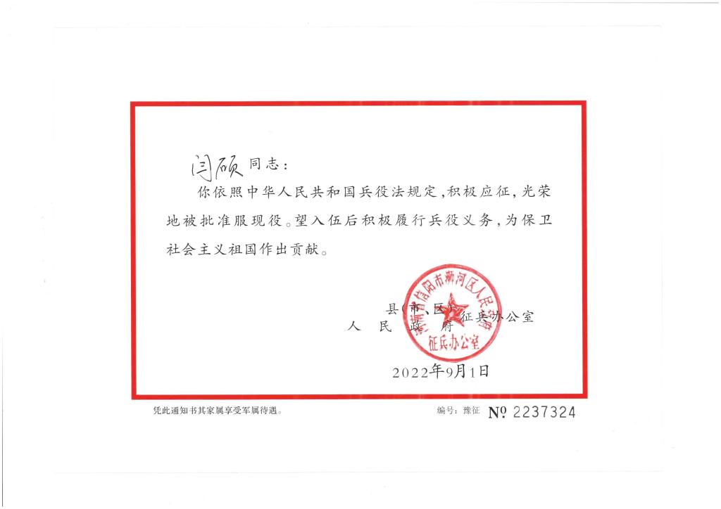 据了解,白杰和闫硕在自身成长过程中便有投身国防、奉献自我的崇高志向,在日常生活中注重提高自身政治觉悟,锤炼意志品质,增强身体素质;在征兵工作中,毅然表明参军意向,主动提交入伍申请材料,并顺利通过层层考核,最终成为一名光荣的义务兵。他们表示,会在军队这个大舞台上施展才华,在军营这个大熔炉中淬炼成钢,将青春与热血挥洒在强军梦、强国梦的伟大实践之中,努力成为一名有灵魂、有本事、有血性、有品德的新时代“四有”军人,为学院增光添彩。据悉,德赢AC米兰官网始终高度重视大学生征兵工作,不断加大工作统筹力度,详细部署学院征兵计划,切实落实征兵宣传工作,通过征兵主题宣讲会、主题班会与主题团日活动、“一对一”指导等途径开展宣传工作,积极动员广大青年学生应征入伍,大力营造“我参军,我光荣”的校园文化氛围,激发德赢官网学子崇尚军人的深厚情怀,进一步提升德赢官网学生报名参军的热情,致力于将更多的高素质人才输送到国防建设中去。