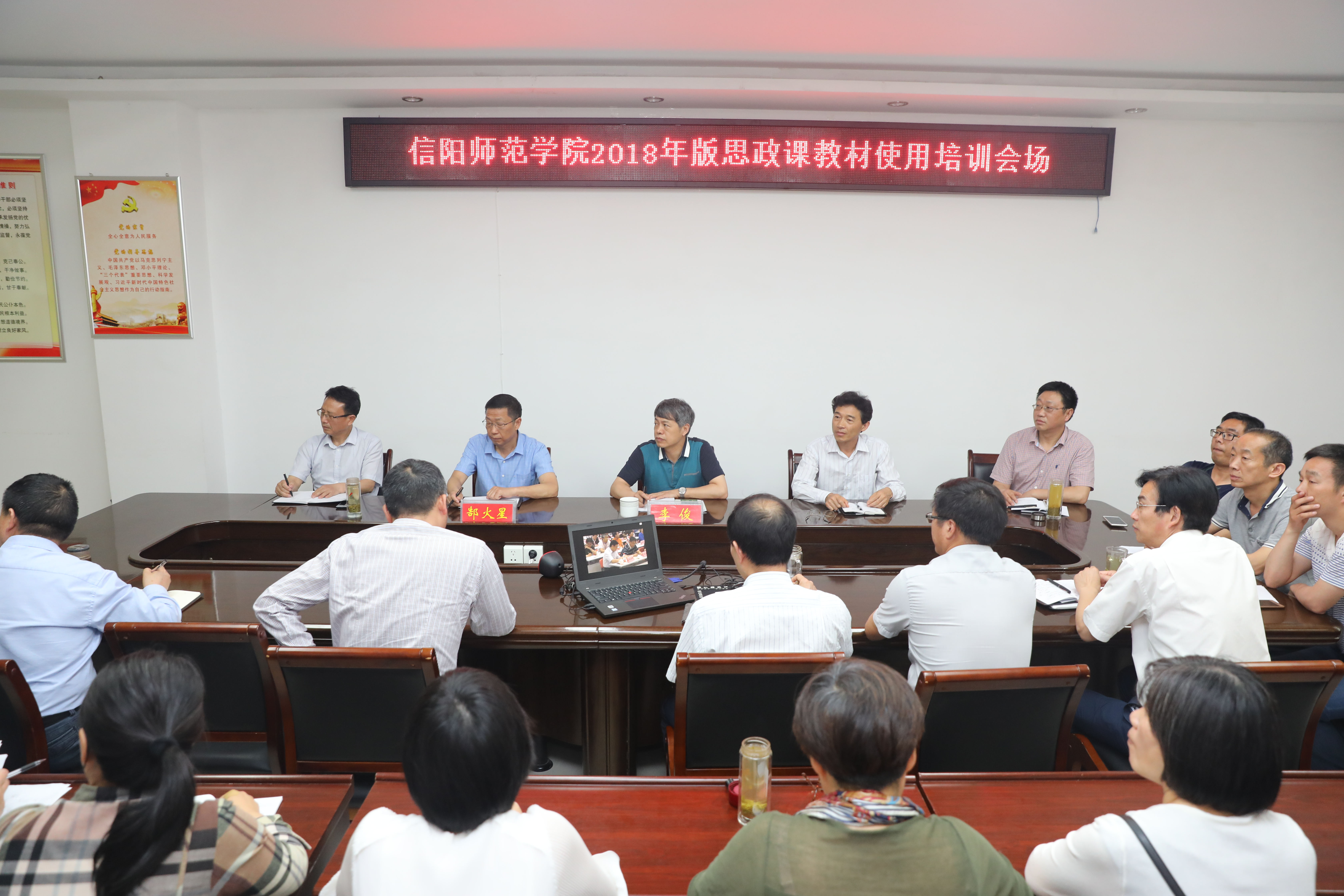 为帮助广大教师更好地把握高校思想政治理论课2018年版教材的主要内容和基本精神,切实用好新教材,根据教育部和省教育厅关于做好思政课2018年版教材使用培训的通知要求,我校在德赢官网会议室设置了培训分会场,并于2018年5月14日下午,在德赢官网会议室正式召开信阳师范学院2018年版思政课教材使用培训会,校长李俊、校党委副书记郜火星亲临会议现场,德赢官网领导班子成员及无课的思政课教师参加了此次会议。会议由院长杨云善主持。