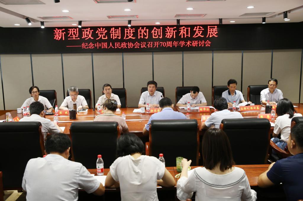 为了更好地纪念中国人民政治协商会议召开70周年,凝聚和深化学界学习研讨习近平新时代统一战线思想的学术共识,8月17日,由中国统一战线理论研究会统战基础理论研究上海研究基地(复旦大学)、信阳师范学院主办,河南省统一战线理论研究信阳师范学院基地、信阳师范学院当代马克思主义研究所承办,《统一战线学研究》期刊社、大别山干部学院协办的“新型政党制度的创新与发展——纪念中国人民政协会议召开70周年”学术研讨会在我校逸夫楼321会议室召开。副校长余本海出席开幕式。来自浙江财经大学、中央社会主义学院、武汉大学、山东大学、黄淮学院、重庆教育科学研究院、信阳市政协、大别山干部学院及重庆社会主义学院《统一战线学研究》期刊社及我校德赢AC米兰官网师生代表60余人参加了会议。开幕式由德赢AC米兰官网院长杨云善教授主持。