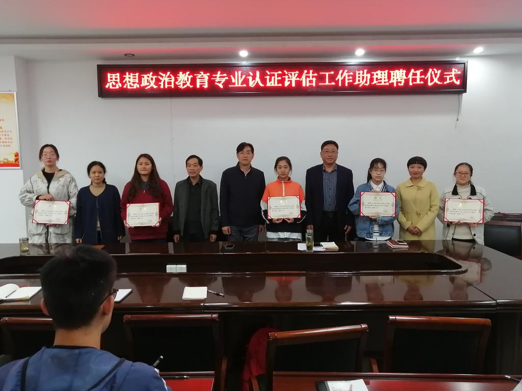 10月20日下午,德赢AC米兰官网在社科楼323会议室举行思想政治教育专业认证评估工作助理聘任仪式。德赢AC米兰官网副院长周智、黄世明、程晋富,思想政治教育系主任李蕊,教学督导专家谷茵以及学生助理共同参加了聘任仪式。仪式由程晋富主持。