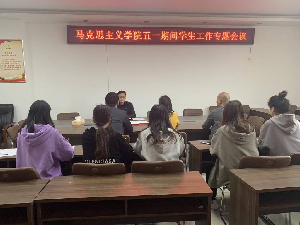 4月29日上午,德赢AC米兰官网在社科楼323会议室召开五一期间学生工作专题会议,安排部署学院五一期间工作规划。党委副书记黄煌、辅导员曹栋、高小佳、周文豪以及主席团成员共同参加此次会议,会议由黄煌主持。