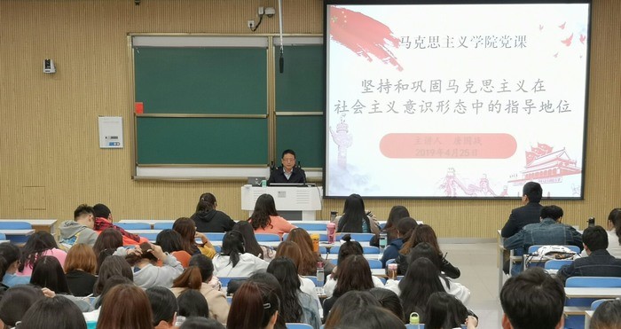 课上,唐国战首先以意识形态为切入点,详细阐述了意识形态的内涵、形成、特征及其重要性。接着,唐国战深入剖析了为什么要坚持马克思主义在社会意识形态中占主导地位。他提出,马克思主义理论是为无产阶级革命设计打造的革命理论,马克思主义作为指导思想彰显了中国特色社会主义鲜亮的文化底色,是坚定四个自信、推进中华民族伟大复兴的保障。但是,当前正处在社会转型阶段,我国在意识形态方面还存在一些问题,新自由主义、历史虚无主义依然存在。最后,唐国战提出,要坚持和巩固马克思主义在社会主义意识形态中的指导地位,就要提高党性,通读马克思主义经典,做到真学真用真信;要坚定理想信念;要学会用政治眼光看待问题;在生活中要严格自律,自觉遵守党的各方面规定和要求。