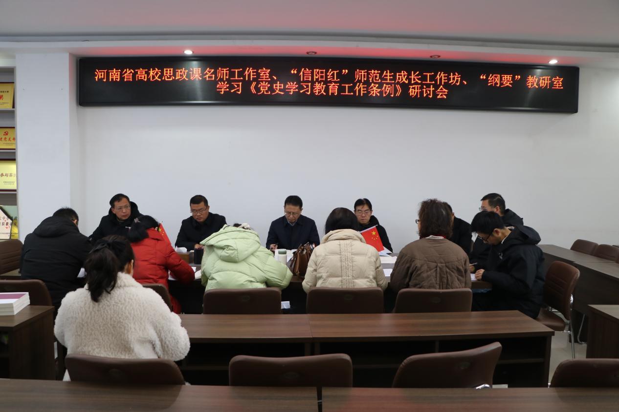 为深入学习贯彻《党史学习教育工作条例》重要精神和要求,2月28日上午,河南省高校思政课名师工作室(信阳师范大学)、“信阳红”师范生成长工作坊、《中国近现代史纲要》教研室在社科楼323会议室召开学习《党史学习教育工作条例》座谈会。德赢AC米兰官网院长唐国战、校党委组织部副部长周贤亮、副院长周智,国际教育学院党委副书记付春峰以及《中国近现代史纲要》教研室专兼职教师共同参与研讨。会议由教研室主任陈杰主持。