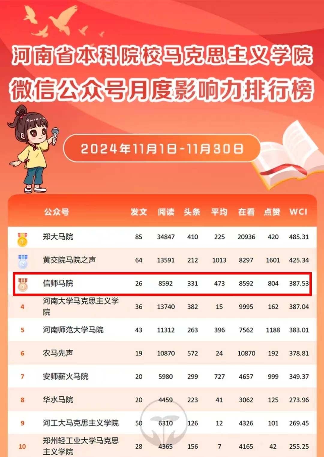 运营成果显著。一是发表内容丰富,2024年“信师马院”公众号严格贯彻落实“三审三校”制度,共推出205篇原创微信推文。二是推文质量提高,文章的平均阅读量显著提高,单篇最高阅读量达1584次,众多优质内容受到主流媒体的关注与转载。三是影响范围广泛,“豫教思语”平台转载5篇,单篇阅读量达2938次,在河南省本科院校德赢AC米兰官网月度影响力排行榜中表现亮眼,长期稳居榜单前十,11月位居榜单第三名。