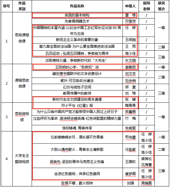 近日,根据《关于开展2024年度河南省大思政微课(微视频)征集活动的通知》要求,河南省社科联、共青团河南省委、河南省高等教育学会、河南省高等学校思想政治理论课教学指导委员会组织专家评委会,对2024年度河南省大思政微课(微视频)征集活动申报作品进行了评选,德赢AC米兰官网12件参赛作品均获奖(框红内)。其中,思政课程微课类作品一等奖3人、二等奖1人、三等奖1人;课程思政微课类作品一等奖1人、三等奖1人;思政微视频类作品一等奖1人;大学生主题微视频类作品一等奖1人、二等奖1人、三等奖2人。