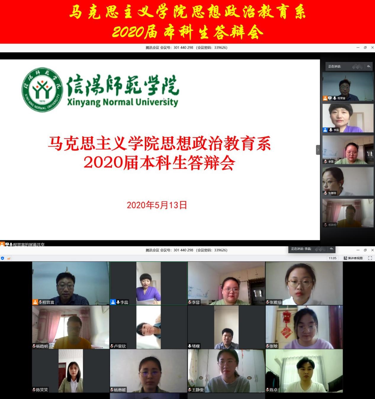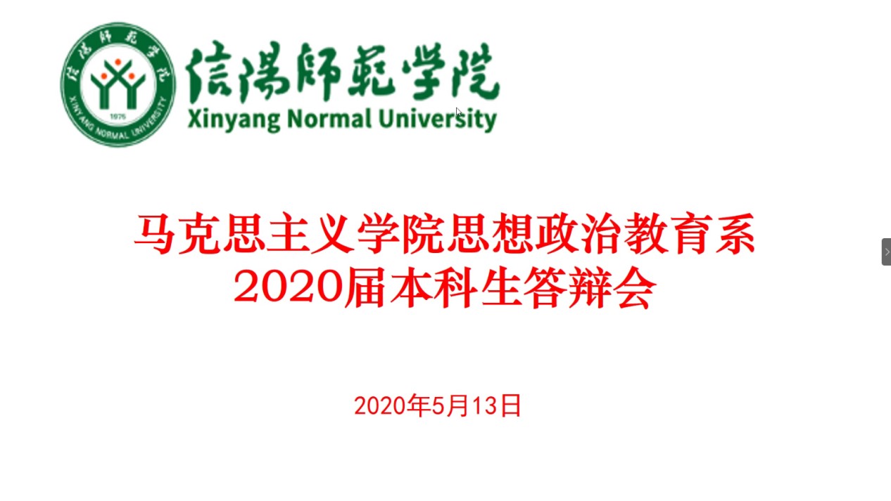 搏“疫”在线,辩出精彩。按照教务处《关于做好2020届本科毕业论文(设计)有关工作的通知》及《德赢AC米兰官网关于2020届思想政治教育专业本科毕业论文答辩工作的通知》要求,德赢官网思想政治教育教研室于5月13日通过腾讯会议平台开展了2020届本科生毕业论文线上答辩会议,程晋富、李蕊、孙绪曙作为答辩专家组老师参加会议,张雅琼、吴素豫、杨惠媛、李昙、卢亚欣、张敏、杨路明、陈笑笑、陈卓、王靖雯10名同学参加了答辩,答辩持续时长近三个小时。会议由李蕊主持。