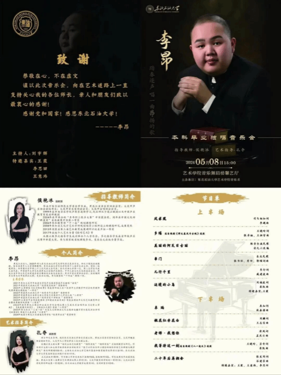 本场音乐会的指导教师为356官网音乐系侯艳冰副教授,艺术指导为音乐系孔夺副教授。李昂在本场音乐会中演唱了《凤求凰》、《乡瑶》、《美丽的阿瓦日古丽》、《串门》、《儿行千里》、《卓玛》、《桃花红杏花白》、《老师,我想你》、《等待这一刻》、《二十年后再相会》等10首曲目。