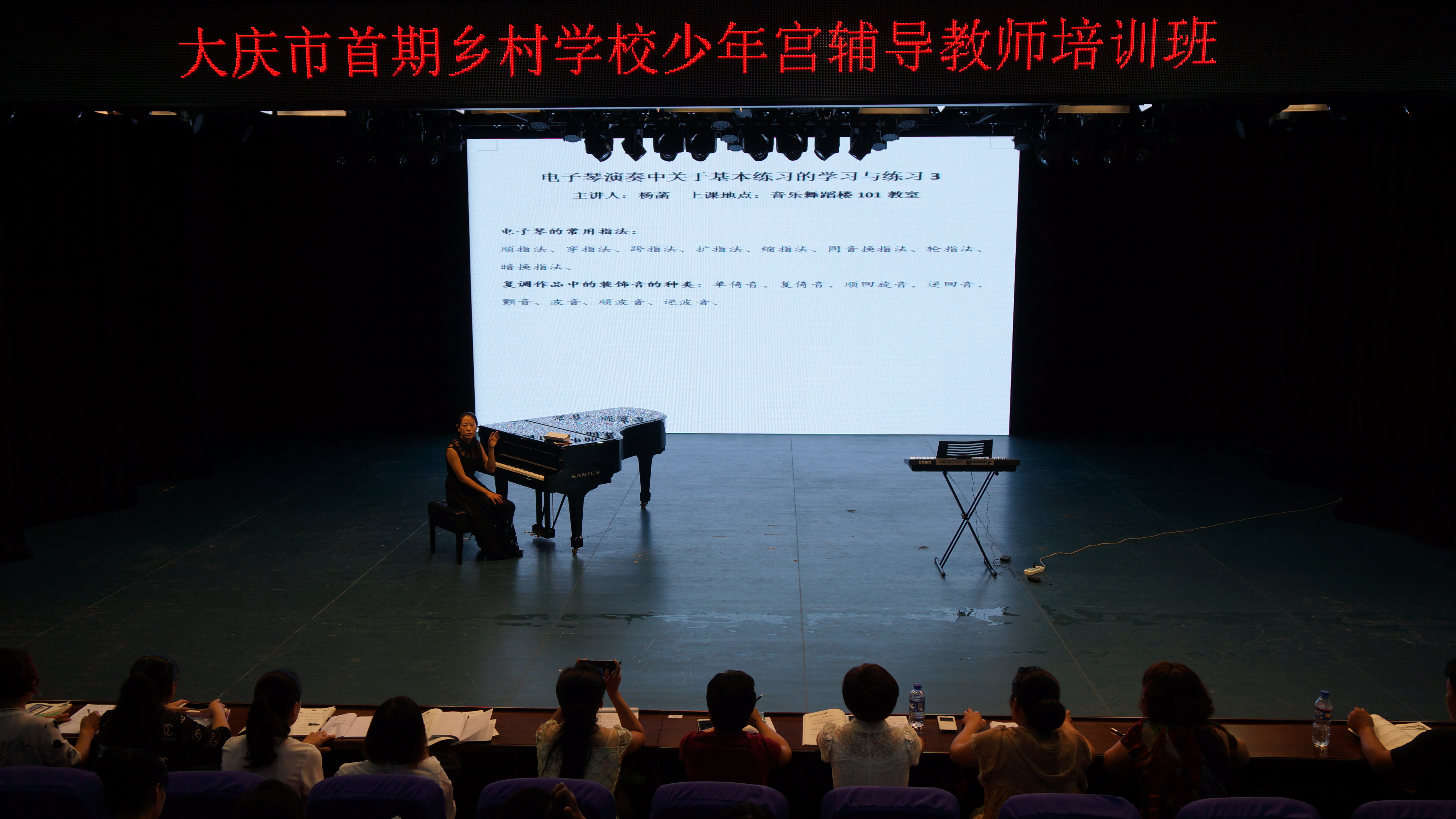 本次培训是大庆市文明办依据《中央专项彩票公益金支持乡村学校少年宫项目管理办法》和《乡村学校少年宫使用管理办法》两个文件精神,通过与我校协商沟通基础上开办的。由我校356体育在线官网艺术实践中心承担培训任务,培训时间为7天。培训以集体课与小组课相结合方式进行,主要培训电子琴演奏的基本方法。