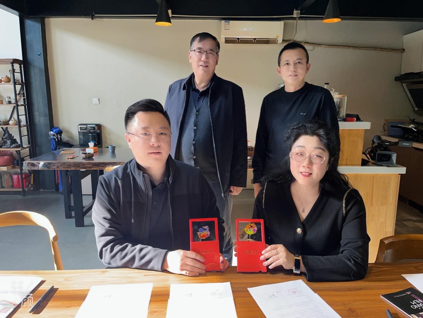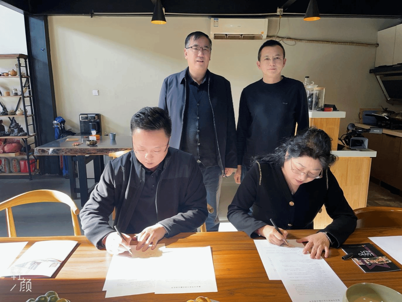 林庆华与董明安签署了《校企合作实习实训就业协议书》,林庆华院长向董明安经理赠送了356官网的特色文创徽章。