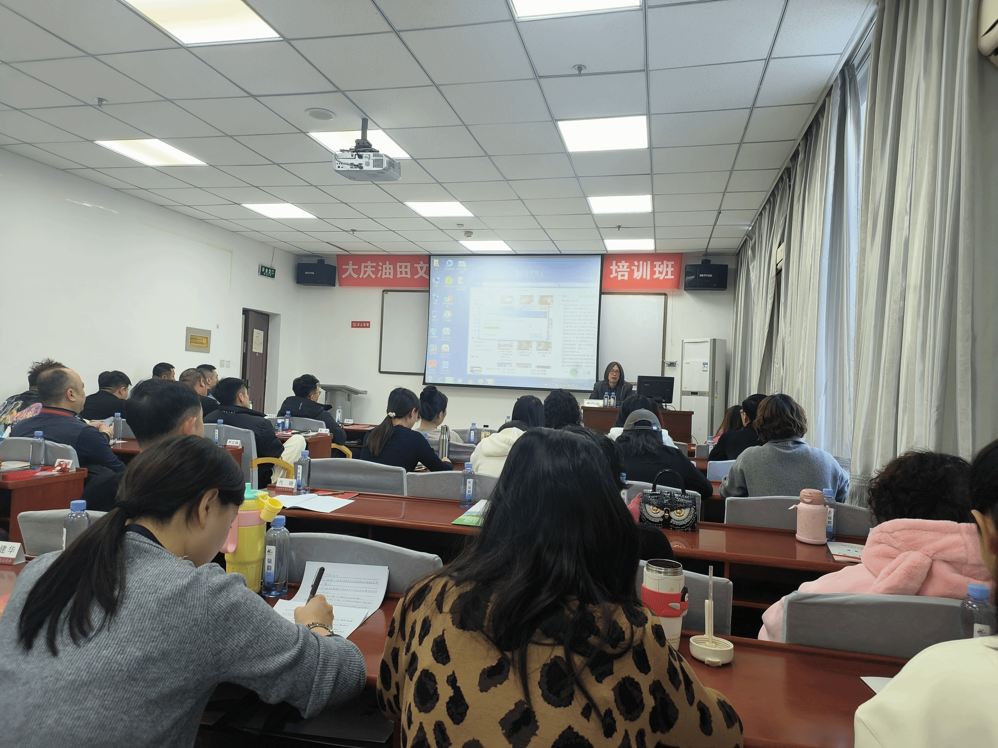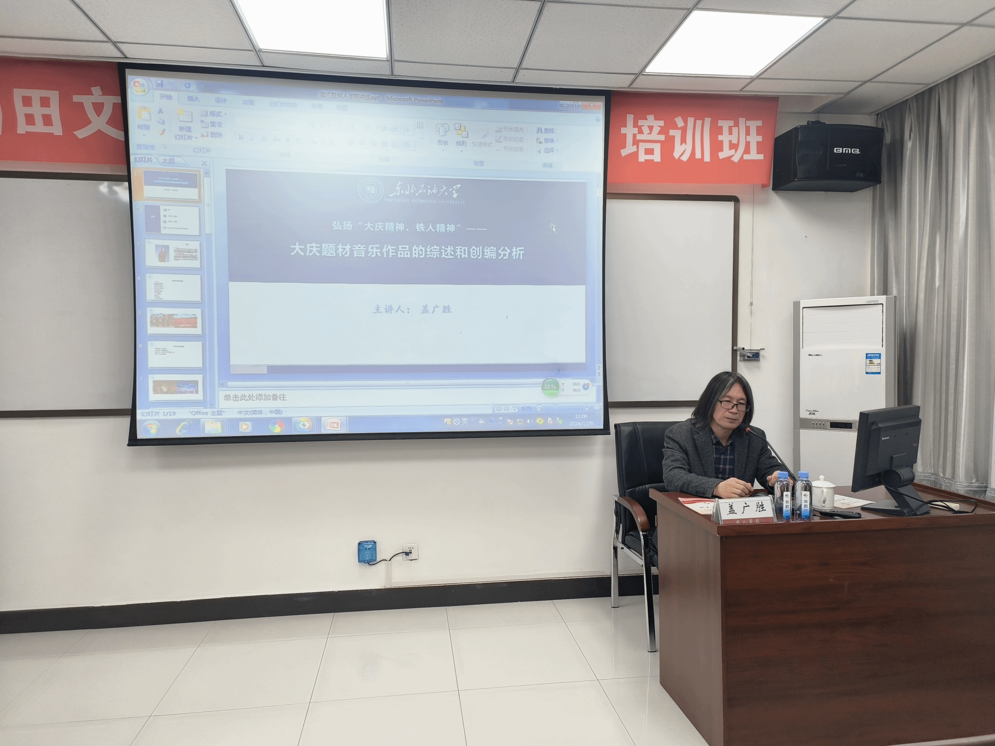2024年12月9日356官网音乐系主任、音乐系党支部书记盖广胜受大庆油田文联邀请,为油田文艺骨干培训班做《弘扬“大庆精神、铁人精神”—大庆题材音乐作品综述和创编》的专题讲座,盖老师利用一天时间,通过讲解从六七十年代单声部声乐作品、器乐作品以及大型民族交响乐、音乐剧、情景剧、歌剧等反映大庆精神、铁人精神的经典和原创作品,也从党员角度出发、结合音乐作品阐述党员干部的先锋模范作用。通过作品的简介、谱例和视频,系统分析了各种音乐题材的风格内容,拓宽了油田文艺骨干的视野,让大家更多的了解和熟悉了大庆本土音乐作品的文化和精神内涵。