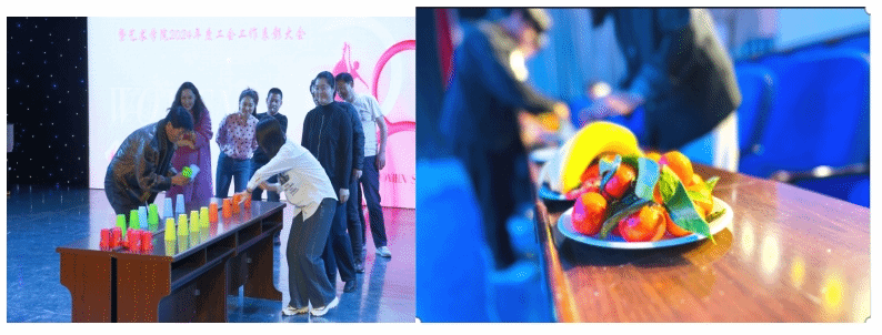 游戏节目热潮迭起,艺术巧思与竞技激情碰撞。套圈、翻杯子、你说我猜、踩气球、面巾纸不落地等游戏先后进行,在场的近70名教职工的加油声、欢呼声此起彼伏。