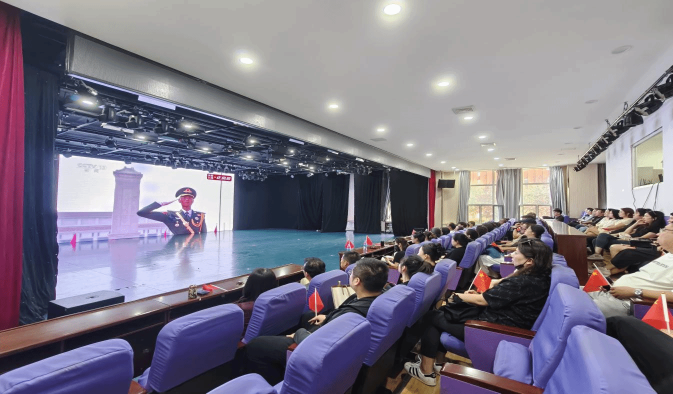 早点8:30,全体教职工和学生便满怀期待地提前来到会场,等待仪式开始。当大屏幕中传来激昂雄壮的国歌声时,在场师生全体起立,齐唱国歌,沉浸在那庄严而骄傲的氛围中。整个观看过程,全体师生都全神贯注,目光紧随镜头移动,不时还发出一声声赞叹,为祖国的强大和繁荣感到无比自豪。