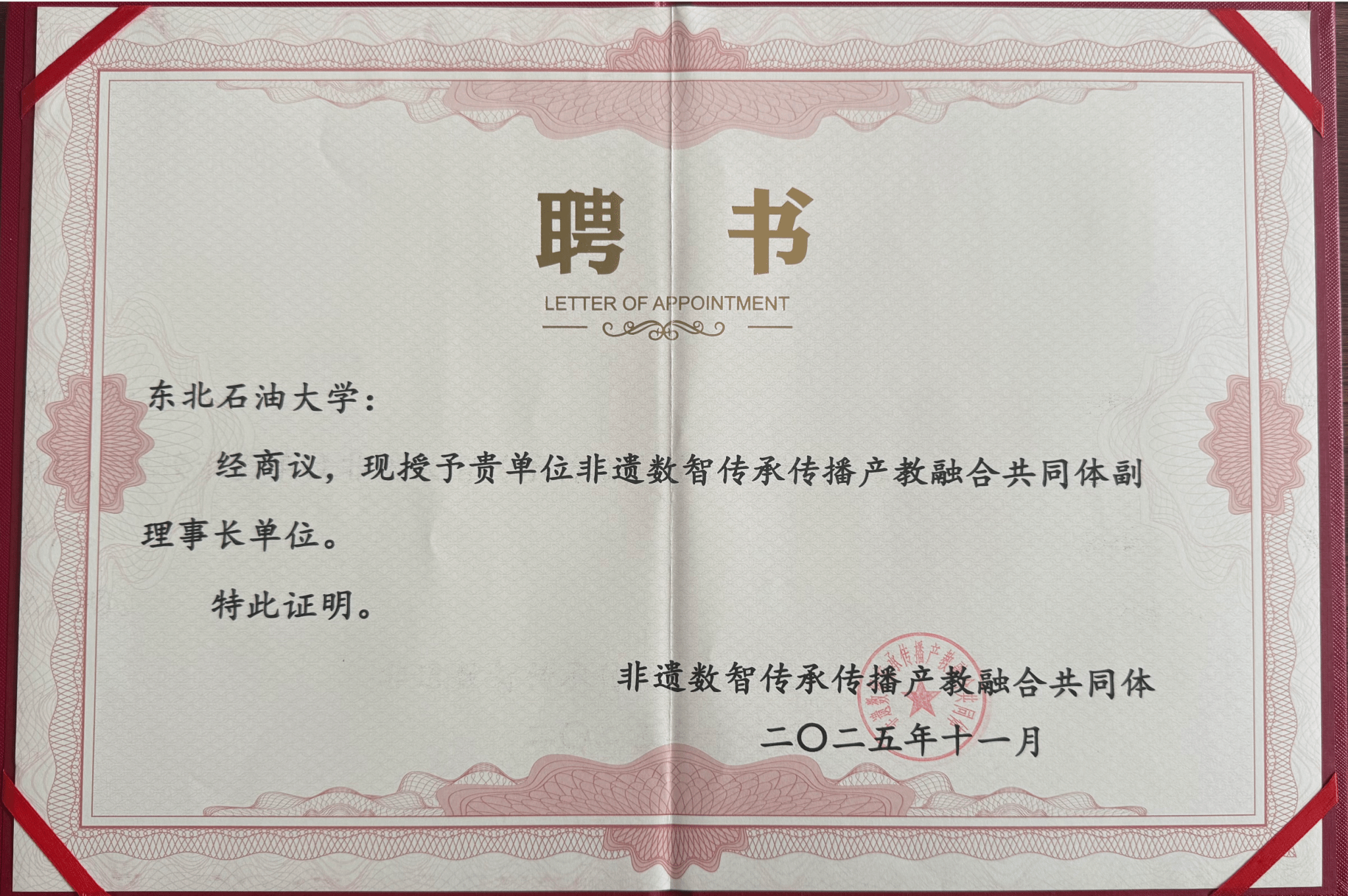站在新的起点上,356体育在线官网将以此次获任全国非遗数智传承传播产教融合共同体副理事长单位为契机,持续深化“新文科”建设内涵,推动非遗传承与高等教育融合发展。我们将进一步拓展“非遗+思政”育人路径,探索具有石油院校特色的非遗教育模式,打造集教学、研究、创新、传播于一体的高水平非遗教育平台。未来,学院将积极加强与国内外相关机构合作,推动非遗数字化、国际化进程,为中华优秀传统文化的传承创新贡献更多智慧与力量,在新时代文化建设的征程中展现高校的使命与担当。