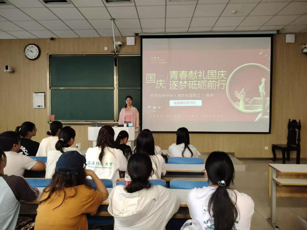 为传承红色基因、弘扬爱国主义精神,10月11日晚上,南湖理论研讨社在社科楼514教室举办“青春献礼国庆,逐梦砥砺前行”主题团课。团课由团支书范茜茜主持,全体成员共同参加。