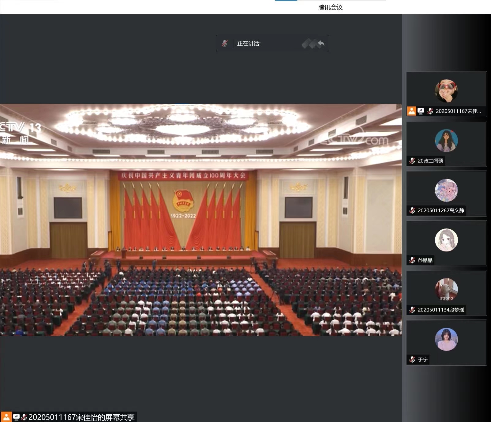 活动伊始,宋佳怡引用了习近平总书记在庆祝中国共青团成立100周年大会上的重要讲话部分内容,强调了深入学习习近平总书记在庆祝中国共青团成立100周年大会上的讲话内容的重要意义。随后,在线播放了习近平总书记在庆祝中国共青团成立100周年大会上的讲话视频,全体青马学员共同学习。最后,随机挑选了四名同学分享感悟。鲁怡萍同学回顾建团百年艰辛历程,感慨团的辉煌来之不易,我们应加倍珍惜。杨可同学感慨于团的对党忠诚,共青团从诞生之日起,就以党的旗帜为旗帜,以党的意志为意志,以党的使命为使命,把党的领导深深融入血脉之中。郝诗语同学与刘俊宏同学从自身出发,表明心志,作为新时代的青年,新时期的共青团员,要自觉听从党和人民的召唤,胸怀“国之大者”,担当使命任务,牢记习近平总书记的嘱托,争做伟大理想的追梦人,争做伟大事业的生力军,让青春在祖国和人民最需要的地方绽放绚丽之花!