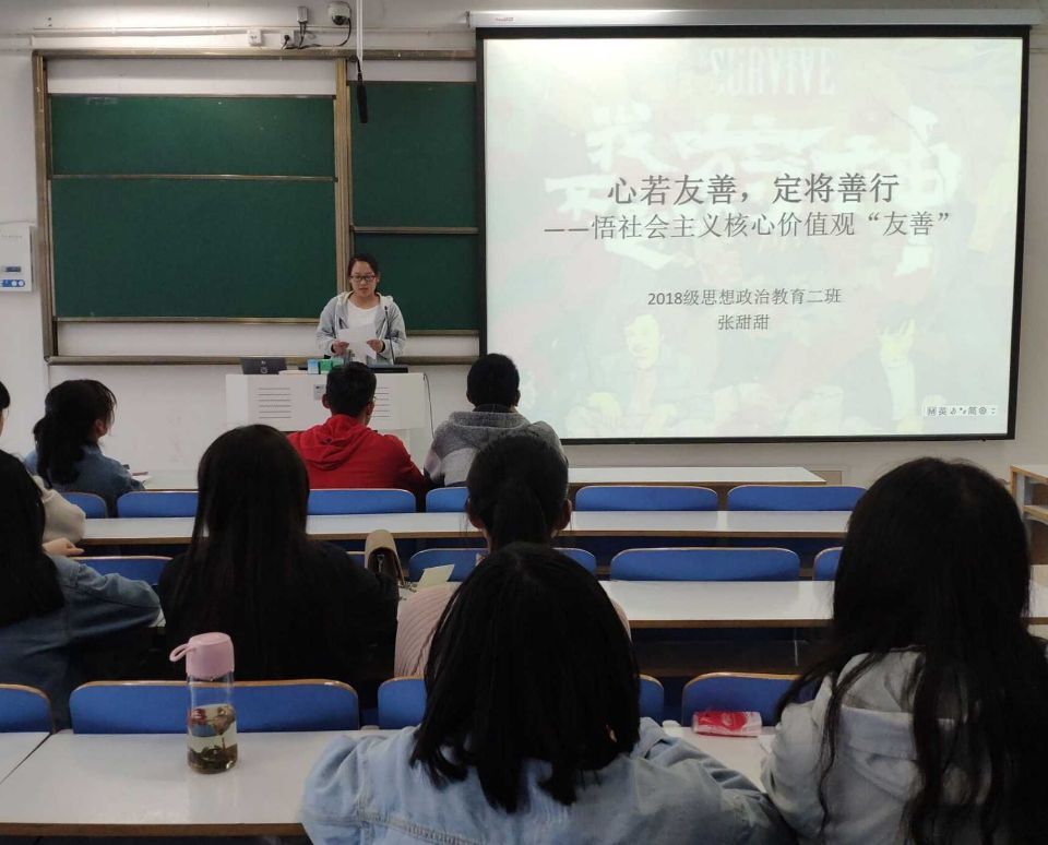 4月10日下午,德赢官网优秀“青马”工程学员张甜甜参加了2018级第二团支部于社科楼516教室开展的讲价值观故事活,并籍此进行宣讲。德赢官网实践部、新闻部、心理健康部相关负责人和2018级各班班委共同参与本次活动。