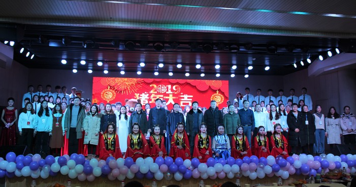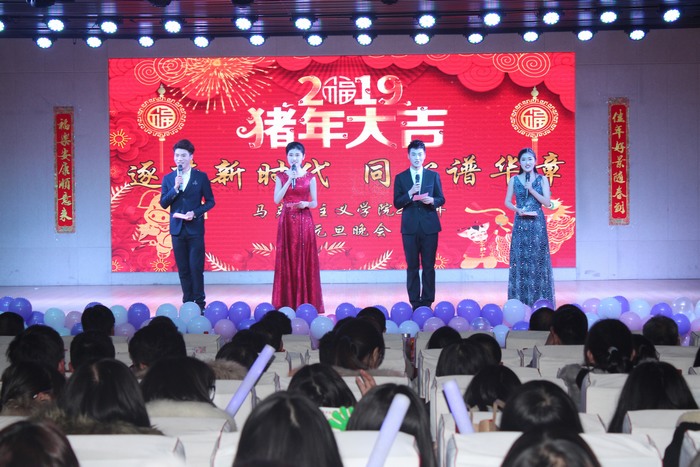 晚会开始前,院领导杨云善、唐国战等以VCR视频的形式总结回顾了2018年的工作,向全院师生表达了新年祝福。整场晚会将过去、现在、未来相串联,浪漫柔情与热情动感并存,流行文化与传统民族文化融合。活力满满的开场舞瞬间引爆全场,拉开了此次晚会的帷幕。轮滑表演和rap《友》使民族文化与现代元素激情碰撞,将晚会气氛瞬间点燃。小品《TFgirls》以诙谐的语言和动作引得在场观众捧腹大笑,向我们传达了追逐梦想不惧失败的深层意义。歌曲串烧《歌声飘过四十年》和舞蹈串烧《民族大团结》以悠扬的歌声和曼妙的舞姿,表达出对改革开放四十年的巨大变化的感慨和中华民族各族儿女对实现中国梦的期待。德赢官网党政领导班子与学生代表共同朗诵的《改革开放四十周年颂:中国奇迹》,饱含深情地歌颂出改革开放后中国特色社会主义建设所取得的伟大成就,将对祖国壮丽山河、对明天的希冀融在诗句中,表达出身为中华儿女的骄傲与自豪。整场晚会气氛高涨,高潮迭起,其中穿插的微信抽奖互动环节和“马院锦鲤”的抽选更加丰富了本场晚会的内容。最后,晚会在新时代合唱团的大合唱《在灿烂的阳光下》中落下帷幕。