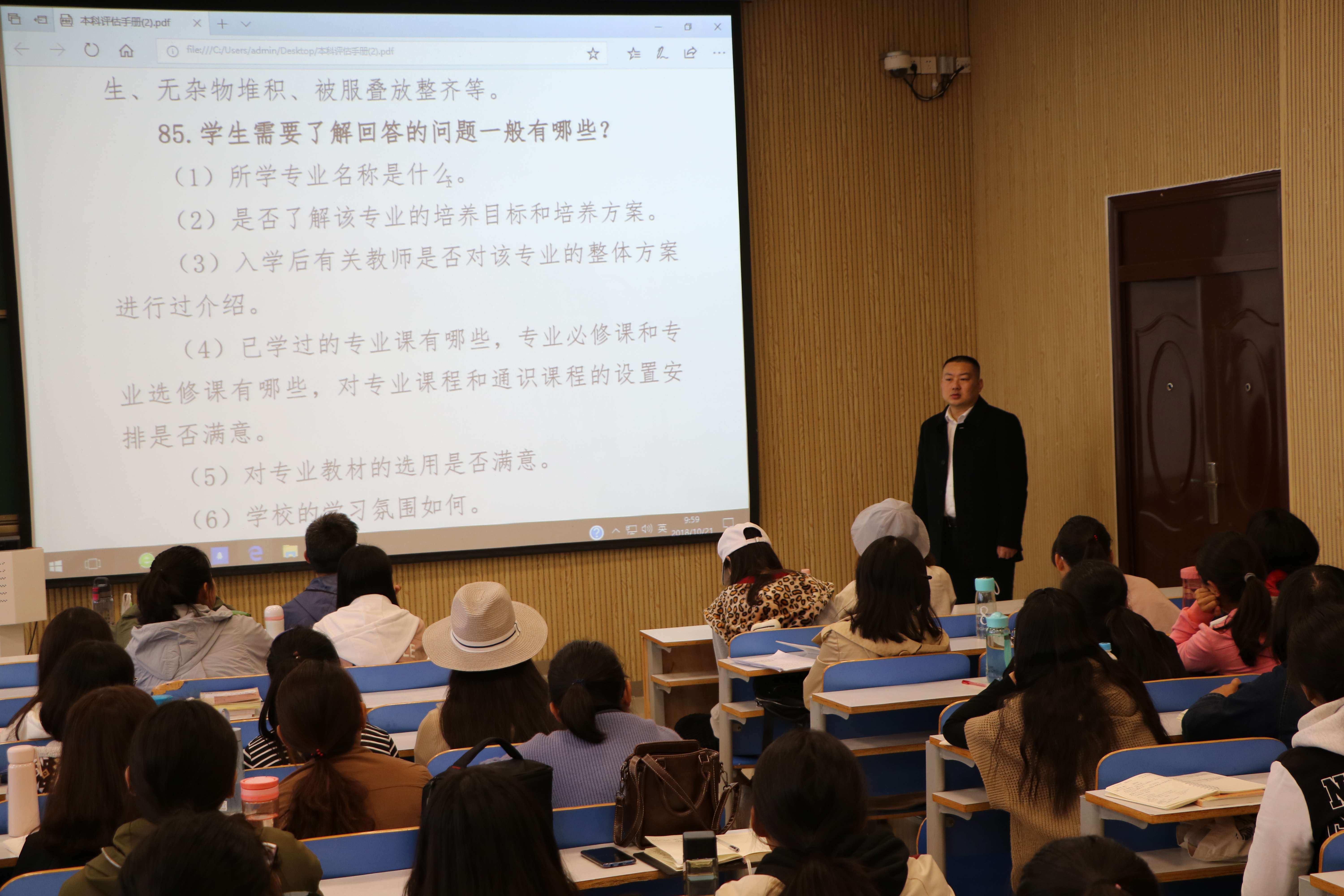 为迎接我校本科教学工作的审核评估,提高德赢官网学生关心评估、了解评估、参与评估、支持评估的意识,10月21日上午,德赢官网在社科楼416、514、515、517教室组织召开审核评估知识学习会。德赢官网全体学生共同参与本次学习会。学习会由各班级负责人带领学习。