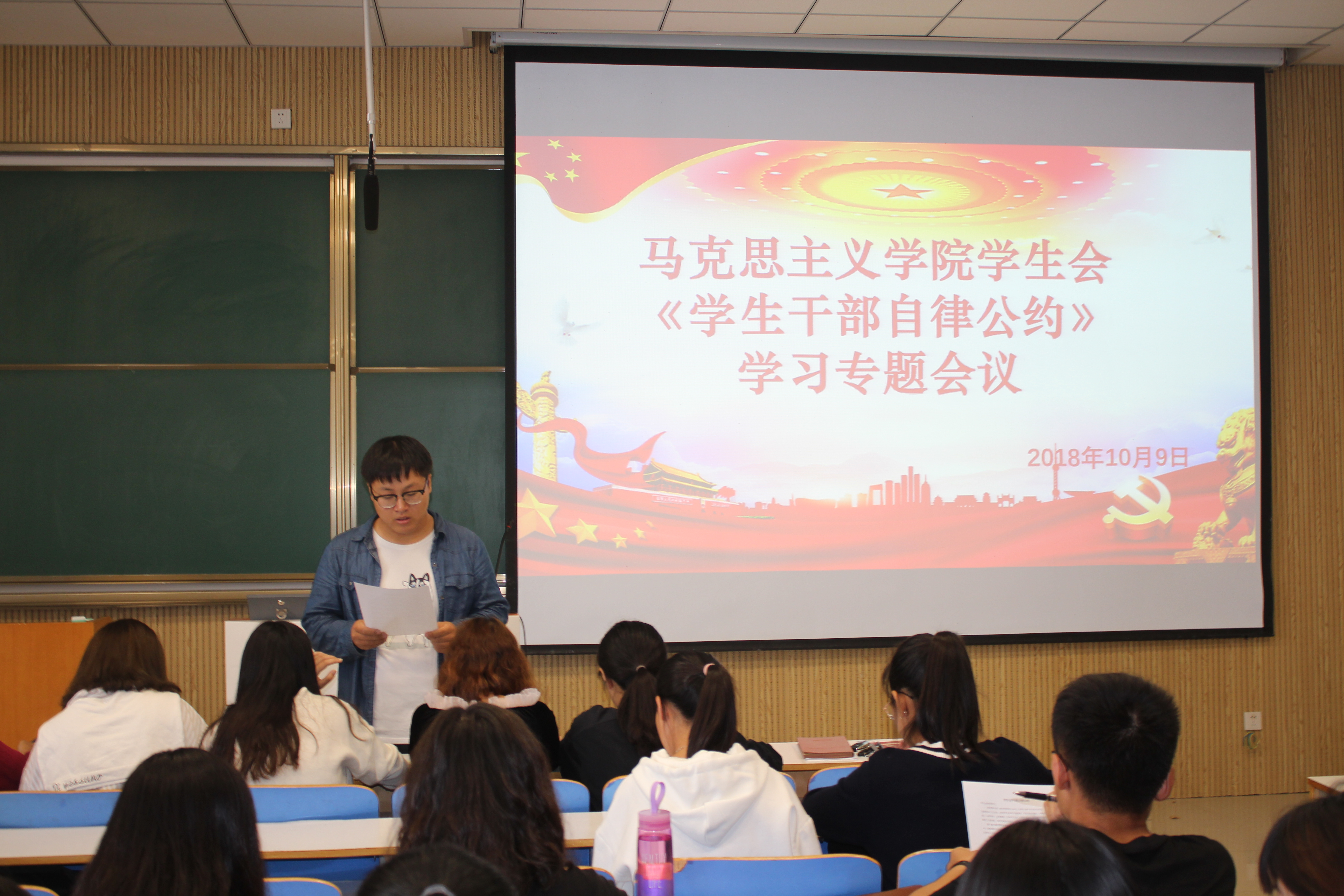 为建设一支胸怀理想、心系同学、品学兼优、作风扎实的学生骨干队伍,10月9日上午,德赢官网在社科楼515教室举行德赢AC米兰官网《学生干部自律公约》学习专题会议。德赢官网学生会主席团,学生会各部门、社团及各班级负责人共同参加此次会议。本次会议由学生会主席史弘扬主持。