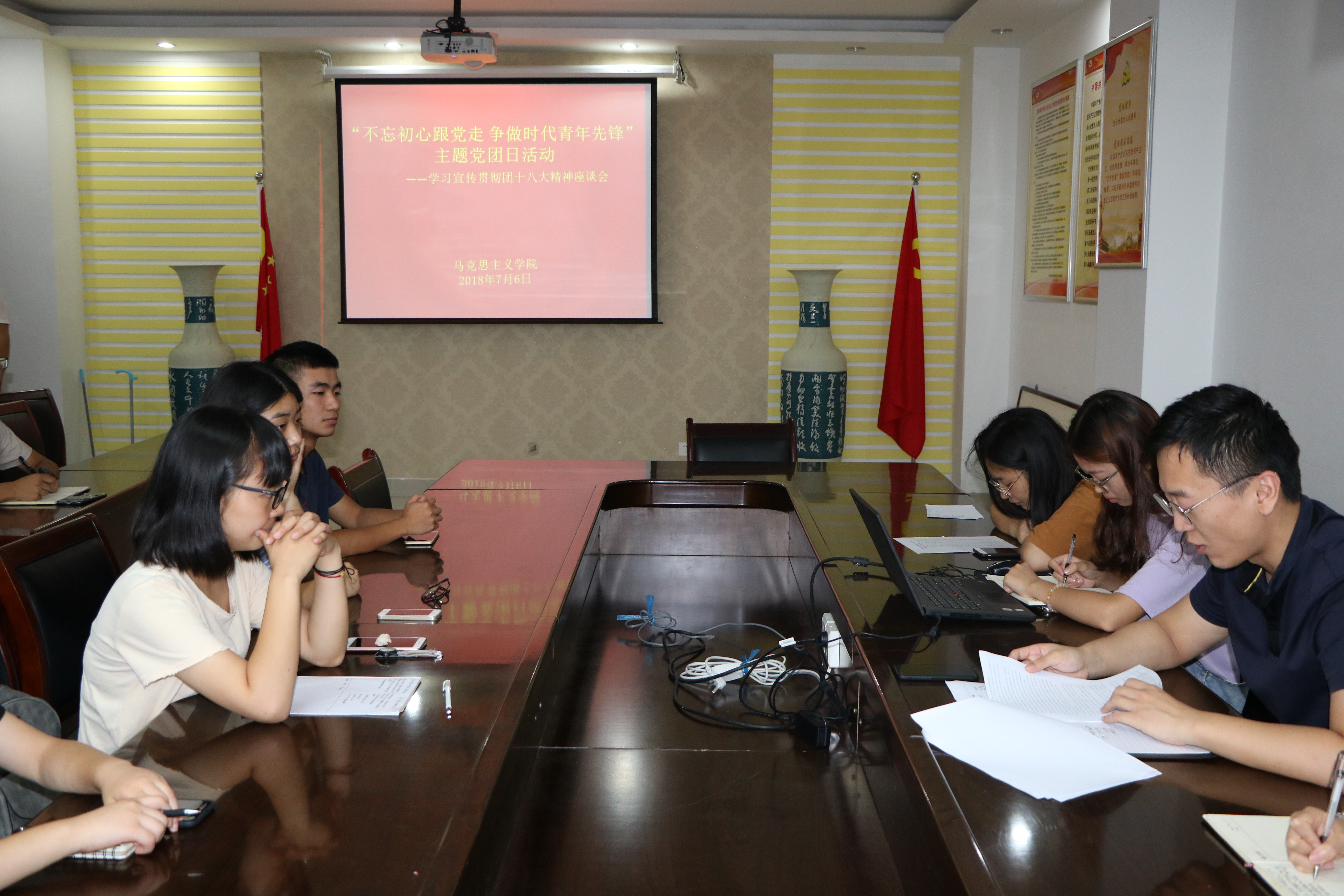 为加强对广大青年团员的教育,学习贯彻习近平新时代中国特色社会主义思想和党的十九大精神,7月6日下午,德赢AC米兰官网于323会议室开展了“不忘初心跟党走,争做时代青年先锋”主题党团日活动,组织团员青年学习座谈中国共产主义青年团第十八次全国代表大会精神。德赢官网团委书记曹栋与20名团员代表共同参加了此次会议。会议由曹栋主持。