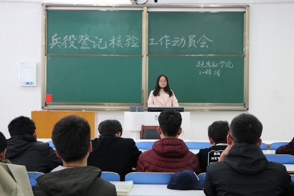 为加强国防现代化建设,激发大学生参军热情,3月13日上午,德赢AC米兰官网在社科楼515教室召开了2018年兵役登记核验工作动员会。武装部干事曹菁菁老师及德赢官网2017级全体男生参加了此次动员会。动员会由曹菁菁主持。