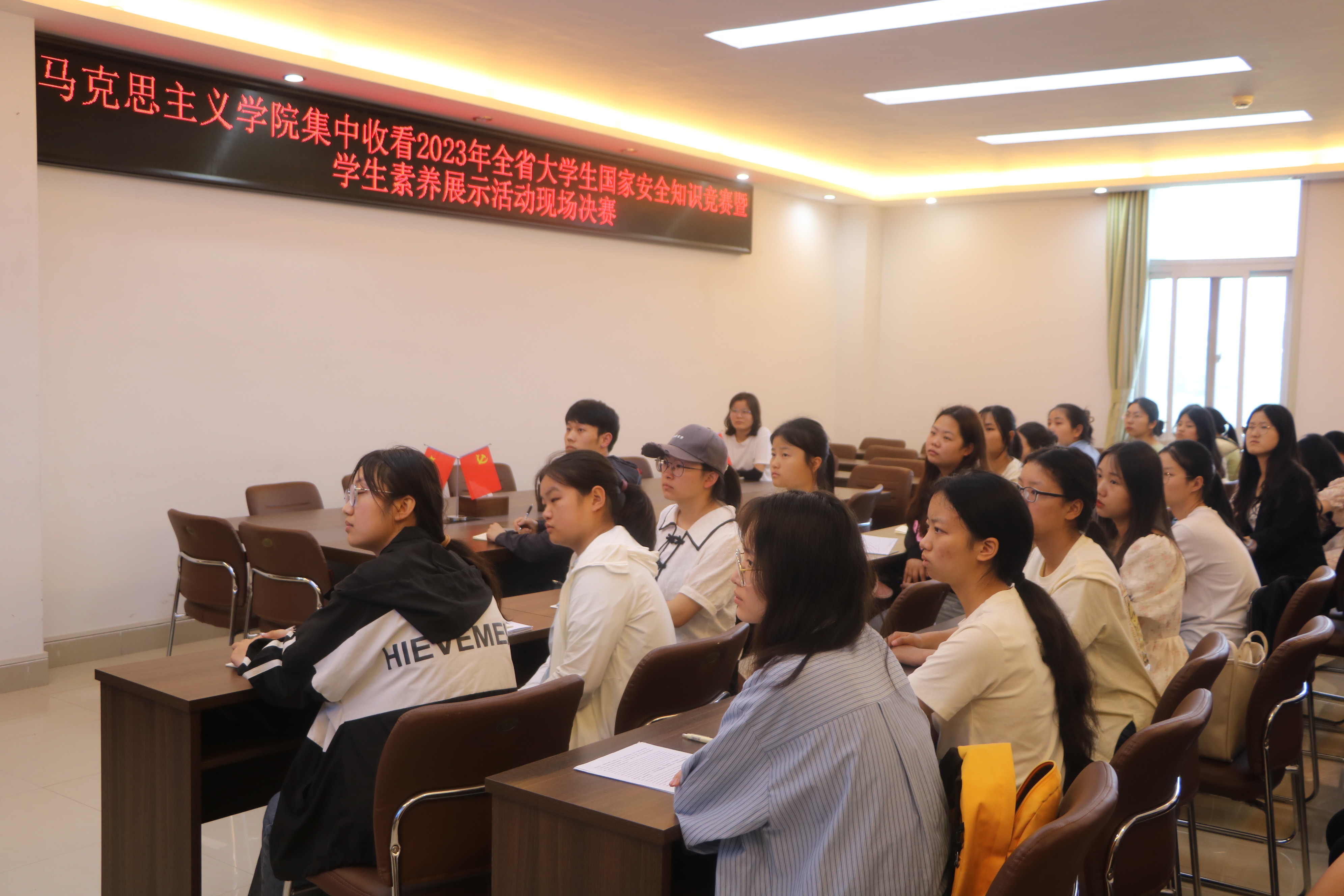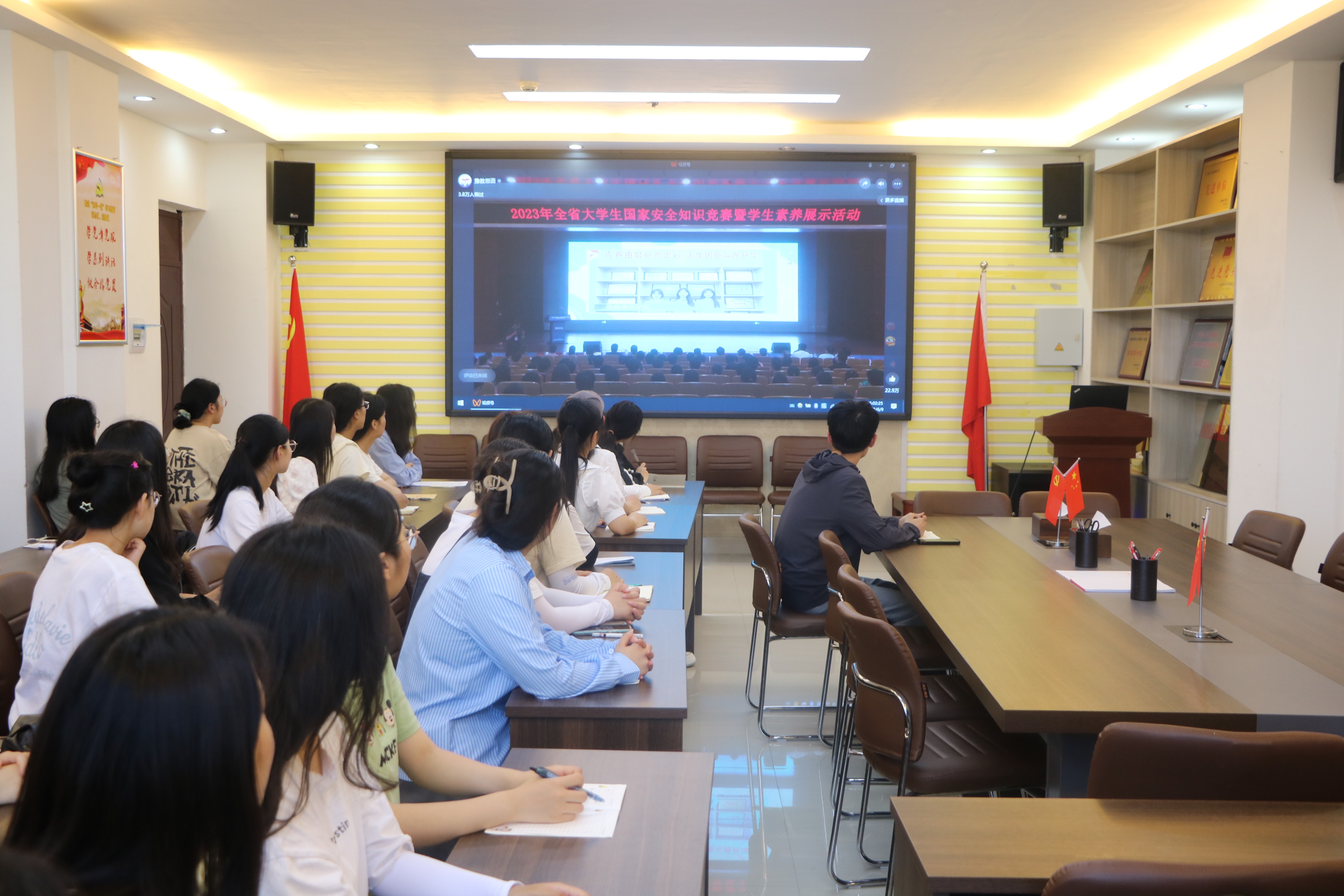 6月9日下午,德赢AC米兰官网在社科楼323会议室组织线上观看“2023 年全省大学生国家安全知识竞赛暨学生素养展示活动现场决赛”。德赢官网专职辅导员沈海蓄、学生会执行主席闫梦辉以及部分学生代表共同观看。