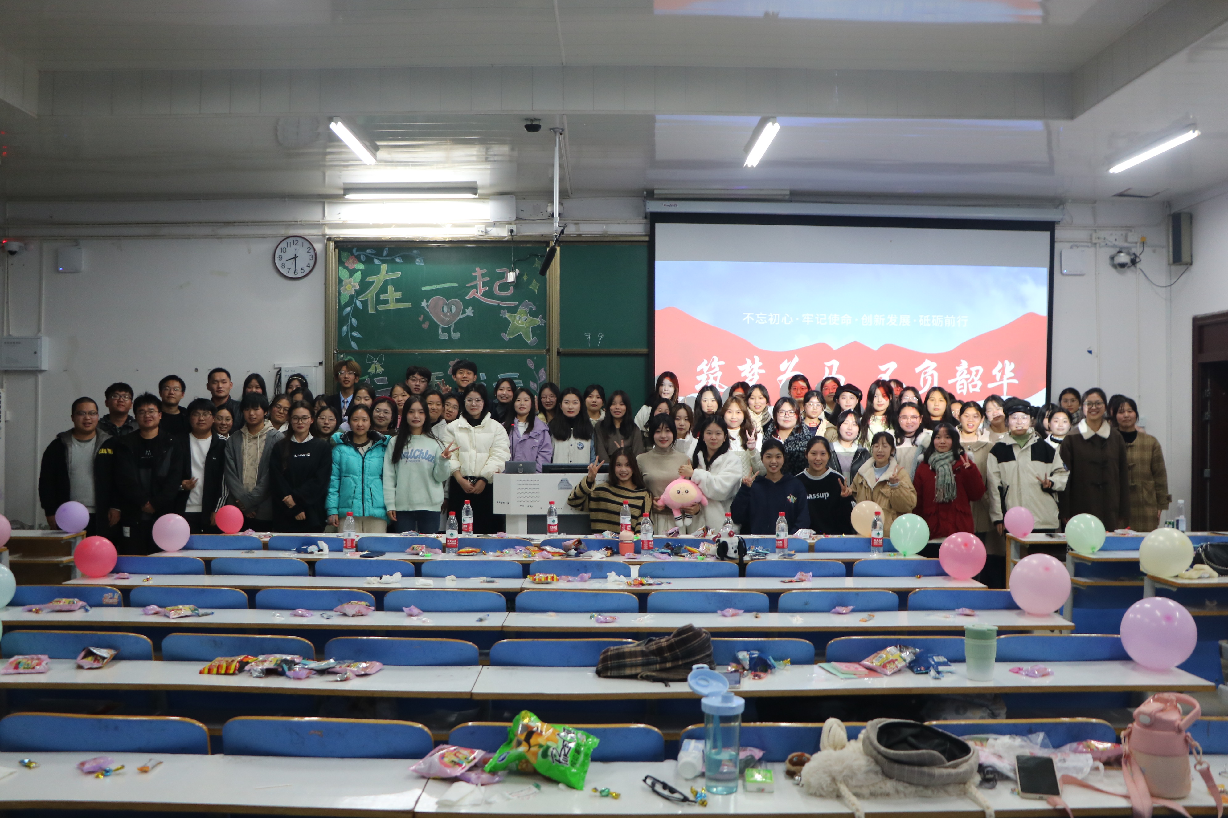 晚会在生动有趣的热场游戏《名字接龙》中拉开帷幕。晚会包括歌曲串烧、情景小剧场、小提琴演奏、诗朗诵等等,一个个节目有序进行,同学们依次上台表演,他们用悦耳的歌声传递快乐,用优美的琴声洗涤心灵,用幽默的短剧带来快乐,用奇特的朗诵方式展现语言魅力。其中,小品《艰难抉择》幽默风趣,给观众带来欢声笑语;歌曲《晴天》将晚会推向了高潮,情真意切的歌声让观众心有所感、深情合唱。晚会中间穿插了许多趣味小游戏,老师和同学们共同参与其中,现场充满欢声笑语。歌曲《一笑倾城》和《追梦赤子心》引起了同学们的热烈反响,同时也为晚会画上了圆满句号。最后,在场人员合影,联谊晚会落下帷幕。