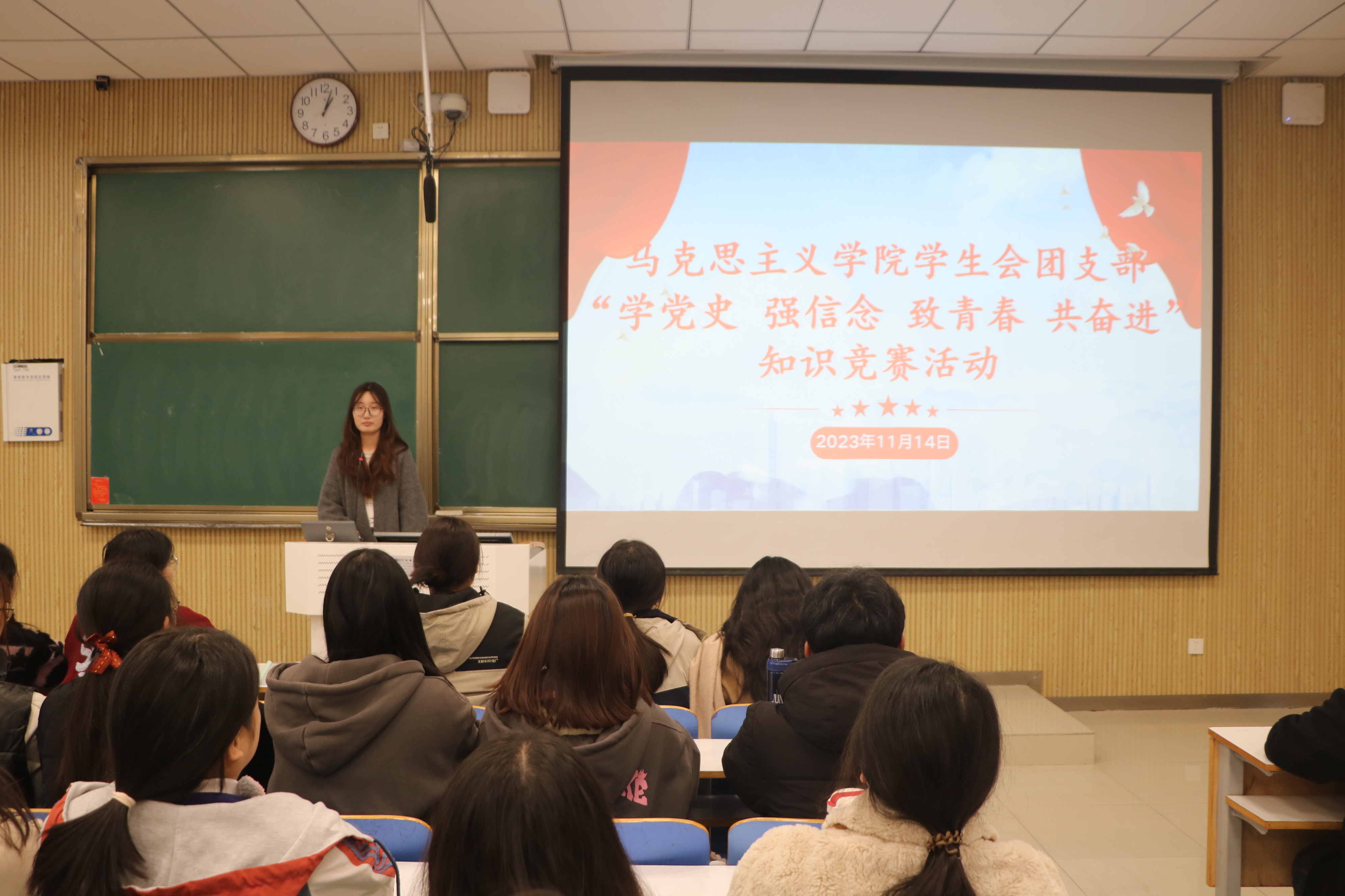 活动伊始,杨可向参赛选手介绍本次竞赛举办的规则和目的。她指出,此次活动旨在加强同学们对党的基本理论、基本路线教育,引导大家铭记党史,坚定理想信念,加强政治素养,提高思想理论水平。本次知识竞赛活动以抢答的形式进行,题目涉及党的重大历史事件、理论知识以及路线、方针、政策等重要内容。比赛开始后,每位参赛者凭借自身丰富的知识储备以及惊人的反应速度进行抢答,积极争取每一个得分的机会。经过激烈的比拼,工作人员对参赛者的得分情况进行统计并颁发奖品。最后,杨可对本次活动作出总结。她强调,百年党史是最好的教科书,一部党的历史是中国共产党百年不懈奋斗史、理论创新史、自身建设史。希望大家能够积极学习党史知识,丰富党的理论知识储备,不断提高自身的党性修养。