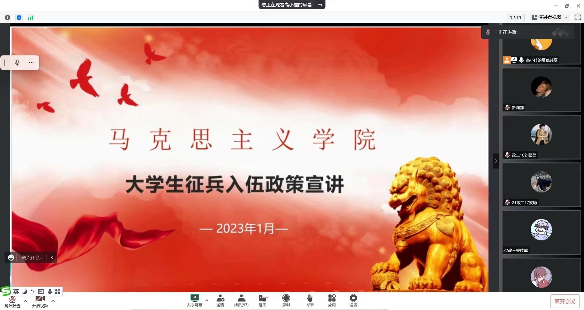 燃青春之热血,铸中华之国魂。为贯彻落实国家征兵政策,鼓励和引导大学生积极应征入伍,1月8日下午,德赢AC米兰官网以线上腾讯会议的方式召开大学生征兵入伍政策宣讲会,德赢官网各级同学踊跃参加。此次宣讲会由团委老师高小佳主持。