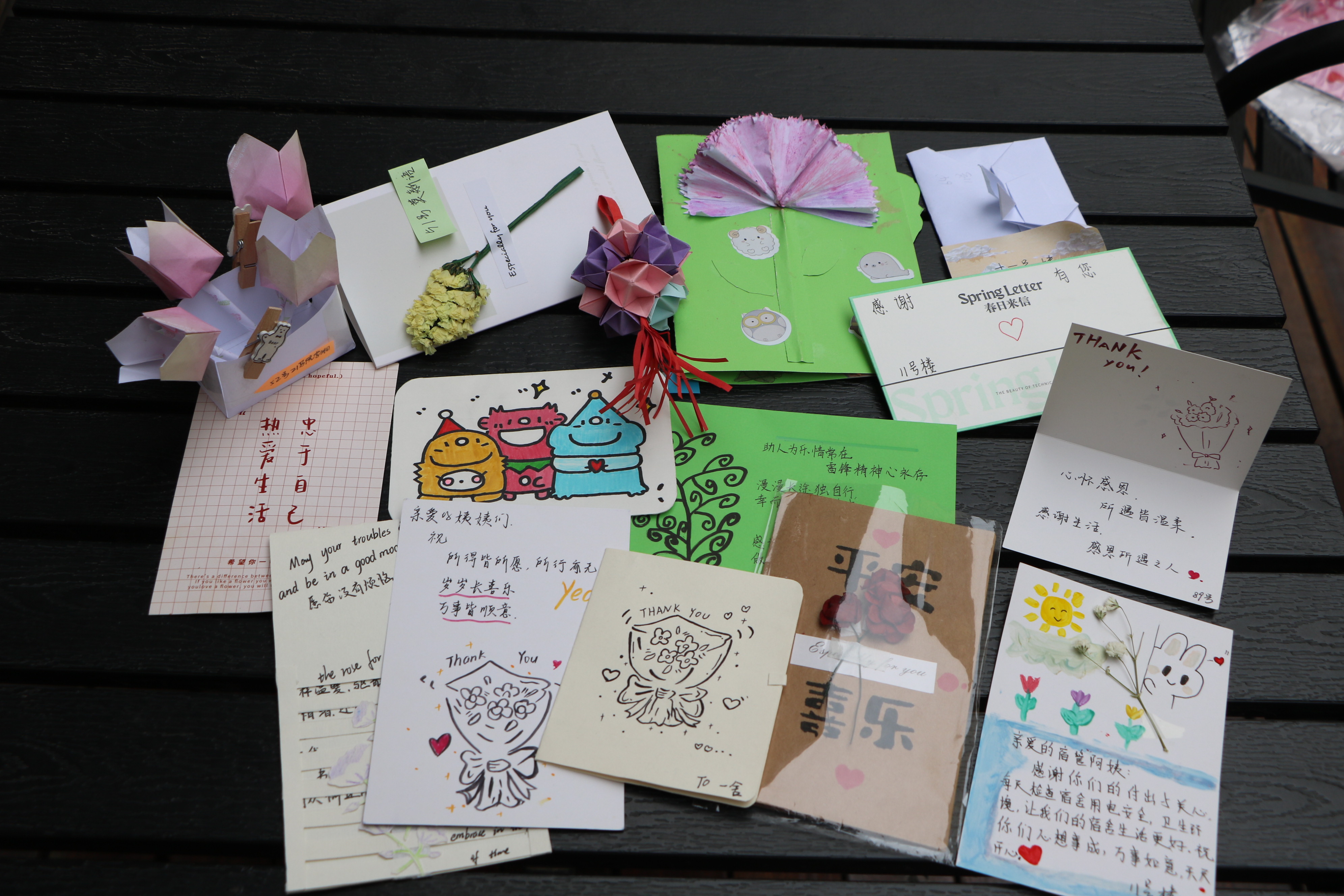 本次活动由前期线上宣传、参与者制作、工作人员收集作品以及赠送作品四个阶段组成。活动前期,工作人员在线上宣传中重点强调了传承雷锋精神对加强思想政治教育、传播社会主义核心 价值观的重要作用,并引导当代大学生积极践行雷锋精神。活动中期,工作人员积极鼓励同学们通过手写信、手工制作、贺卡等多种方式对宿管阿姨的工作表示感谢。同学们的作品采用画笔和鲜花装饰,图画精美,字里行间的情谊温暖人心。其中,部分同学的手工作品以立体折纸的方式呈现,构思巧妙,突显用心。活动后期,工作人员对收集到的作品按照宿舍楼号进行分类,并将同学们的真挚情感传递到宿管阿姨手中。