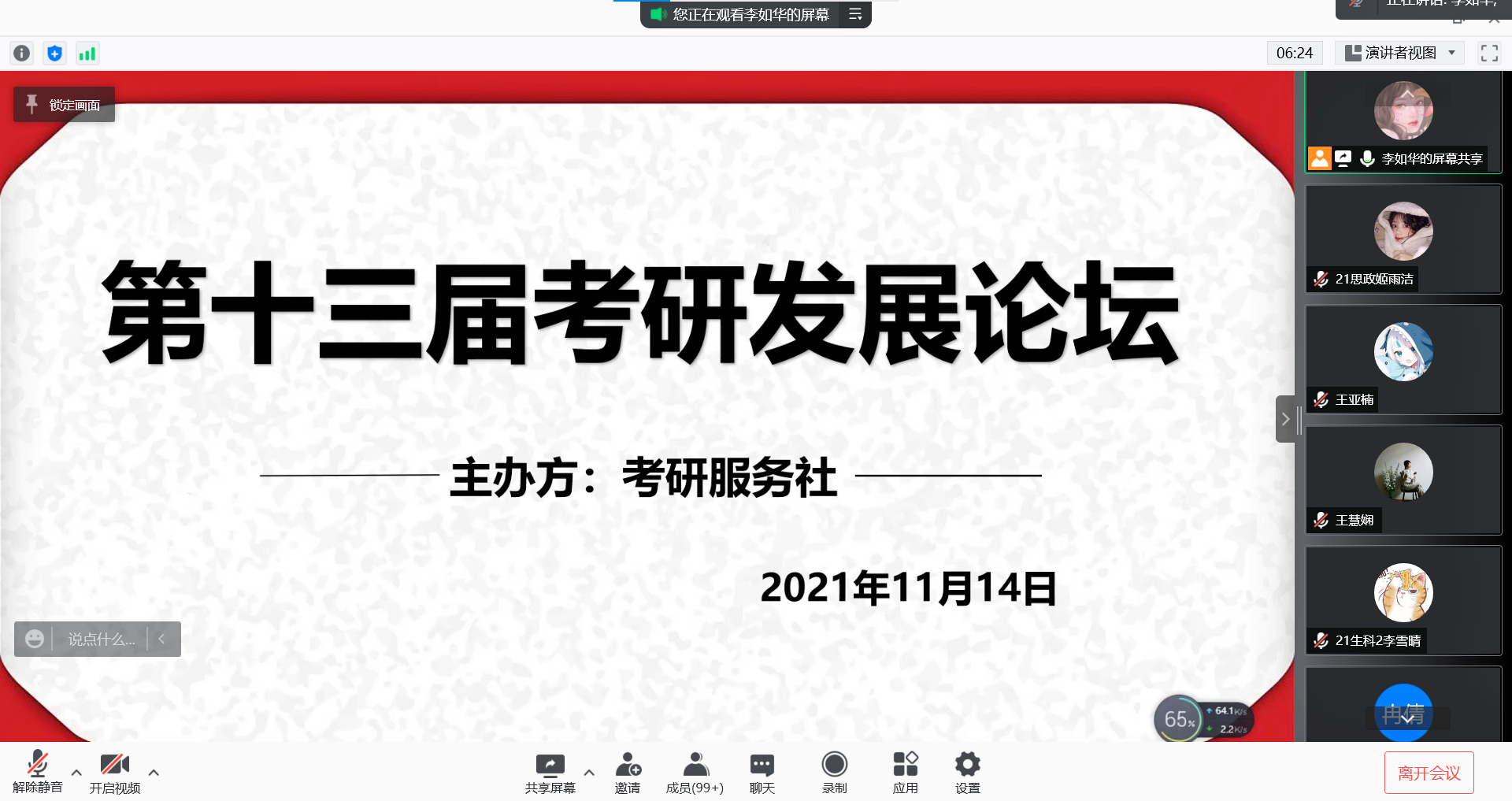 11月14日晚,德赢AC米兰官网考研服务社在腾讯会议举办第十三届考研发展论坛。德赢AC米兰官网党委副书记黄煌、团委书记曹栋、校学生会社团部以及数百名学子通过腾讯会议参加本次论坛,论坛由邵子原、刘程祎主持。
