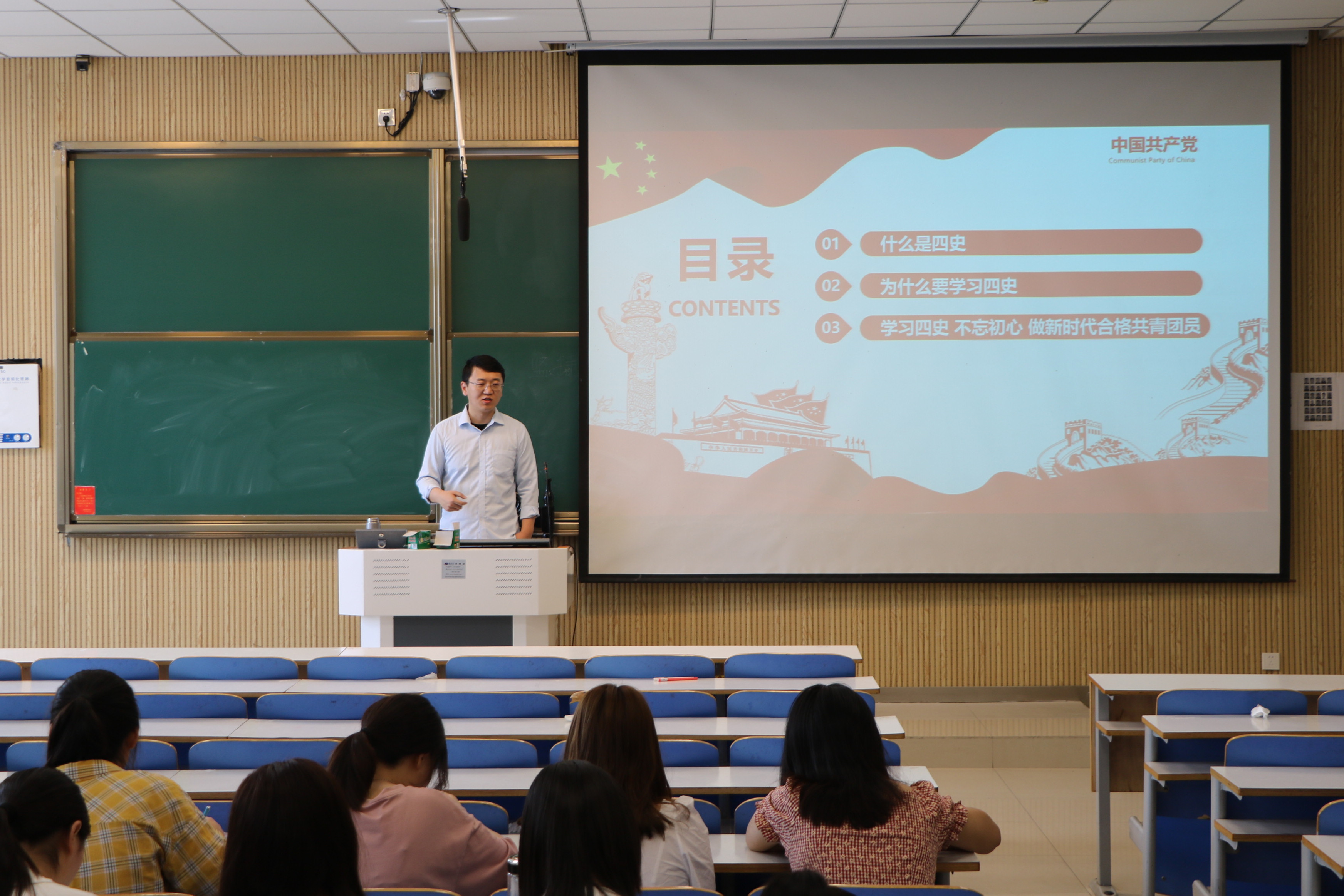 曹栋依次从“什么是四史”、“为什么要学习四史”、“不忘初心,做新时代合格党员、团员”三个方面对四史知识的学习与践行展开讲述。他指出,“四史”学习走进学校、深入课堂,对于增强同学们的爱国主义精神、提升党性修养与工作能力具有重要意义,同学们应主动学习,认真领会。随后,曹栋对同学们如何成为新时代合格党员、团员提出要求。他强调,党员要自觉做到政治本色不改变、理论学习不放松。广大团员作为党的得力助手和后备军,要积极向党组织靠拢,锤炼过硬本领,为党和国家的伟大事业贡献青春力量。最后,曹栋就毕业生离校的相关事宜为同学们作详细介绍与悉心指导。