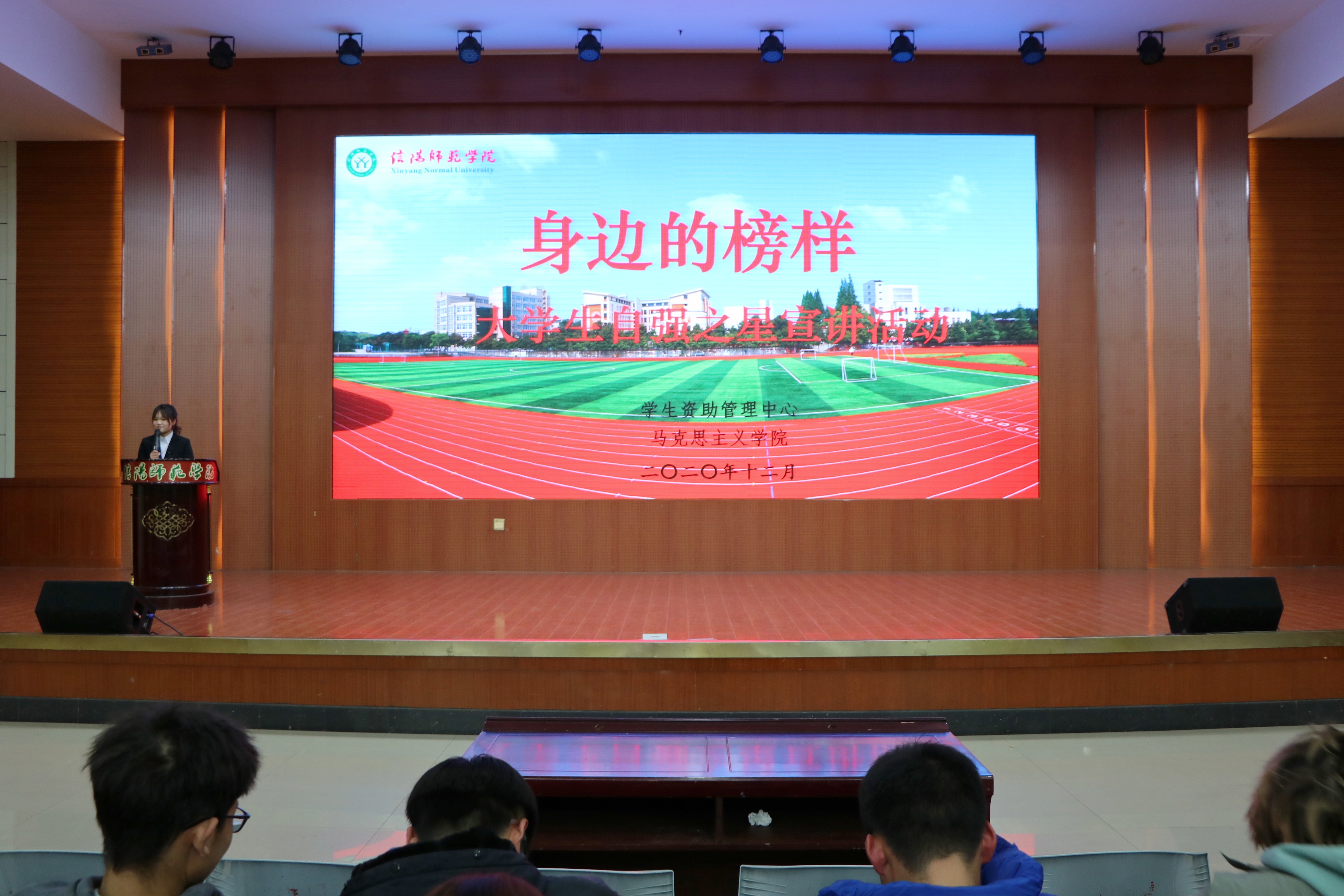 为大力推进大学生思想教育工作,彰显榜样力量,激励德赢官网学子艰苦奋斗、顽强拼搏,12月16日晚,由德赢AC米兰官网主办的“身边的榜样”大学生宣讲活动在逸夫楼报告厅举办。德赢官网团委老师曹菁菁、数学与统计学院贾晴岚、体育学院王梦卓、音乐与舞蹈学院许美佳以及德赢官网2019级、2020级全体学生共同参加此次活动。活动由曹菁菁主持。
