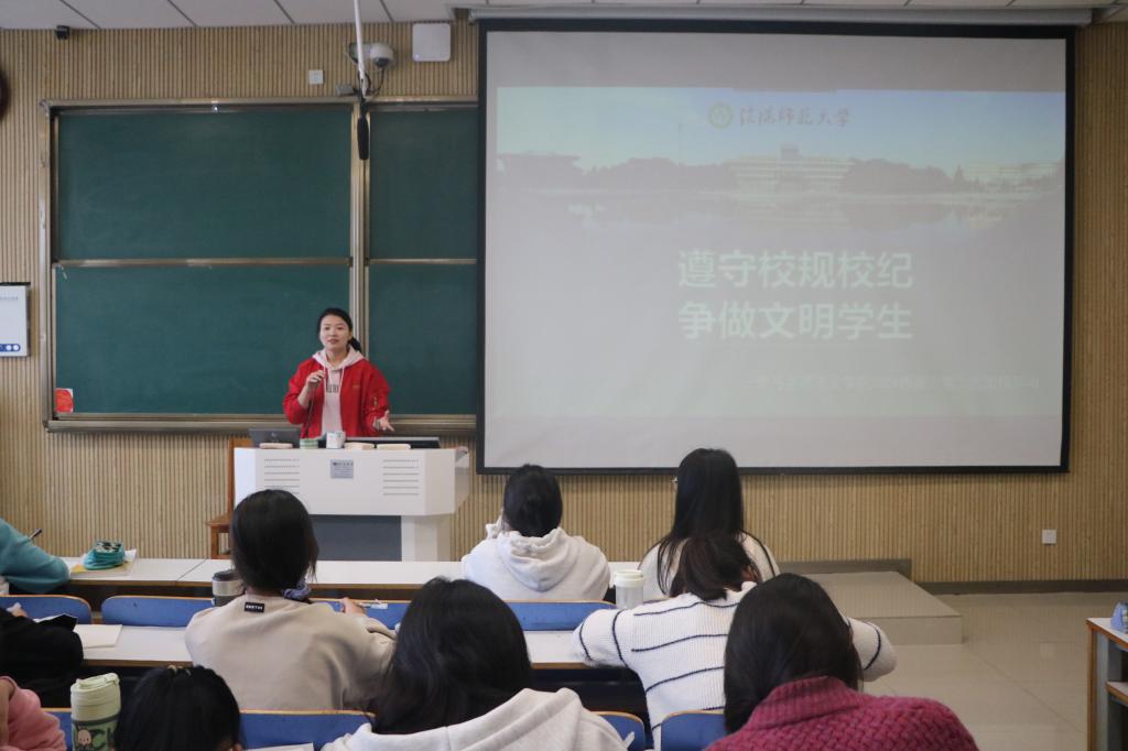 此次活动旨在引导新生深刻理解遵守校规校纪的重要性,并通过实际行动展现文明学生的形象。团课伊始,翟伟以我校校训“厚德崇实,善学敏行”为切入点,从我校的人才培养目标“四实”以及校风展开叙述,展示了我校办学的总体思想理念,让同学们对信阳师范大学有更深入的了解,更强的归属感和认同感。接着,她向同学们全面阐释了综合素质测评细则,帮助同学们了解相应加分项和扣分项,明确作为我校学生的行为准则。随后,她结合实际案例,带领同学们了解部分违规处分实施方法,讲述纪律处分的概念和类型,具体说明了遵守纪律的重要性。最后,陶青青指出,校规校纪是学校制定的一系列规章制度,同学们要积极学习校规校纪,自觉遵守校规校纪,勇于维护校规校纪,在校规校纪的指引下养成良好行为习惯,在规定的范围内行使自己的自由权。