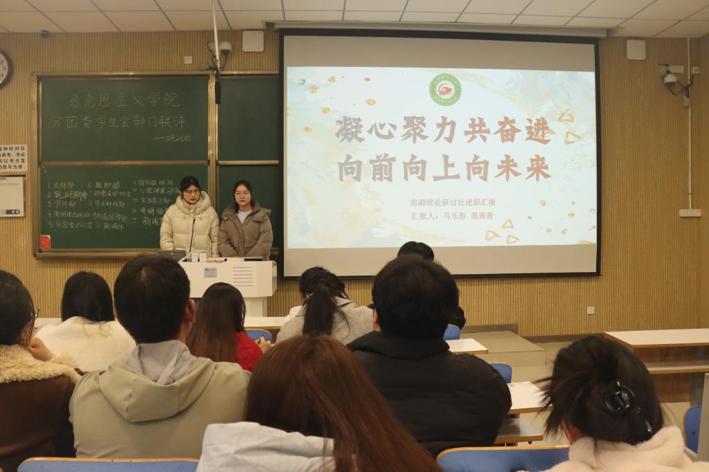大会伊始,陶青青老师肯定过去一年学生会各个部门的工作,希望新学期各部门发挥优势、各司其职,高效完成工作。联评环节中,各部门负责人就工作成效、特色品牌、部门组织框架、不足之处等进行述职报告。学生会主席团的成员们从各部门的工作实效、创新性、团队协作等方面进行了综合评分。经过激烈角逐,南湖理论研讨社凭借出色的汇报和丰富的工作成果,真正做到立足专业特色创新活动机制、拓宽视野格局、坚定价值导向、完善工作机制,获评综合第一。