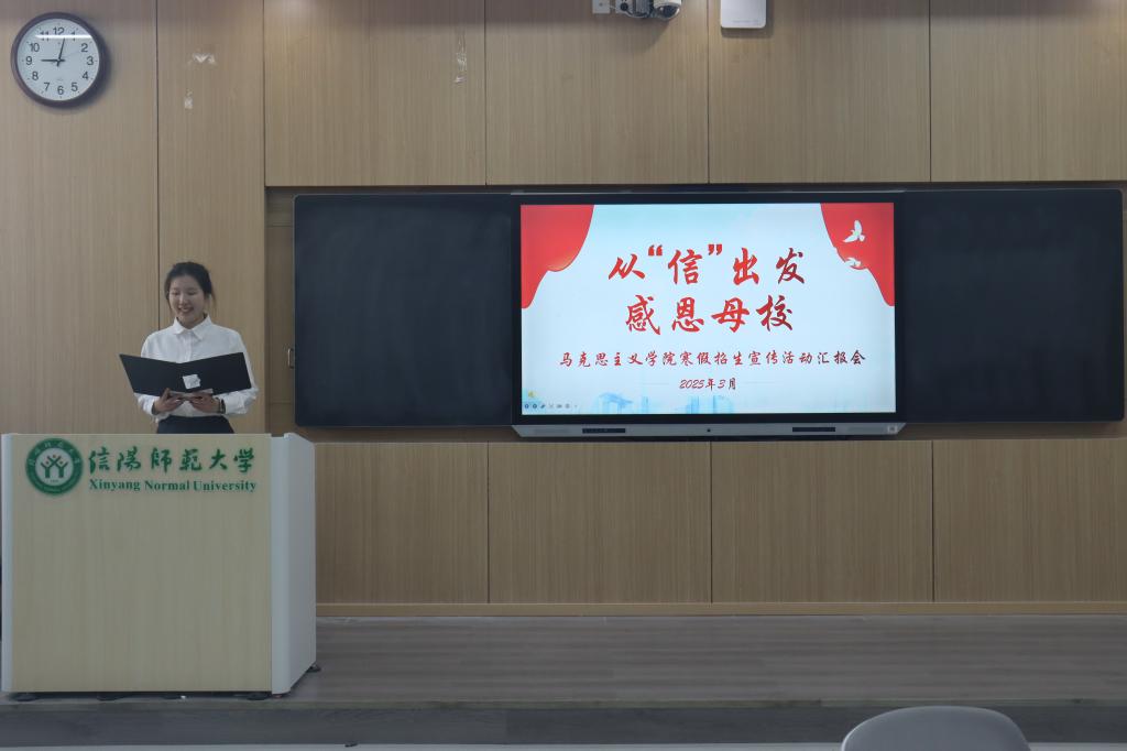 会议伊始,张珊珊介绍了本次寒假社会实践活动的宗旨和意义。接着,由寒假招生宣传团队代表按照抽签顺序依次上台进行汇报演讲。各小组借助PPT演示、宣传视频等多种形式,从多方面切入,介绍了寒假招生宣传的成果与收获,向更多同学传递了信阳师范大学的育人理念。其中“携‘信’返梓,向‘阳’而行”团队用心制作“做不被定义的star”信件,为学生送去鼓励,点燃学子们的升学热情。
