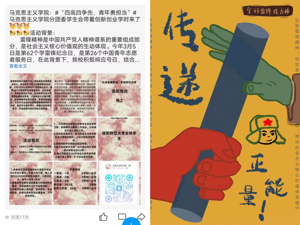 为积极响应时代号召,引导学生深入理解雷锋精神的内涵,培养能担大任、挑大梁的新时代大学生,3月中旬,德赢AC米兰官网分团委学生会举办了主题为“践行雷锋精神,争做时代先锋”的海报设计活动。本次活动由德赢AC米兰官网学生会生活劳卫部主办,新闻部协办,活动对象为信阳师范大学全体学生。