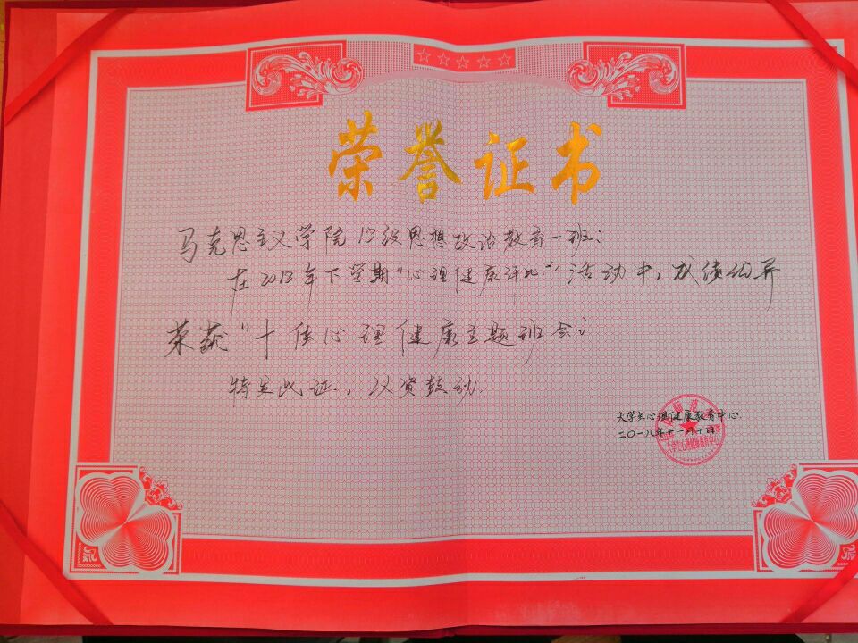 根据学校“心理健康教育主题班会”评比活动的相关要求,德赢官网代表班级2018级思想政治教育一班因心理健康教育班会内容充实、形式丰富,有一定实用价值,荣获“十佳心理健康教育主题班会”的称号。特对前一阶段德赢官网心理健康教育工作积极分子进行表彰。
